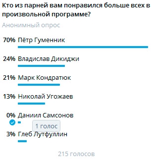 >дорогие друзья, в произвольной программе я, к сожалению, участие принять не смогу по состоянию здоровья. >сейчас оперативно буду проходить лечение , чтобы побыстрее вернуться к возможности выполнять полноценные нагрузки. >увидимся уже на следующих соревнованиях