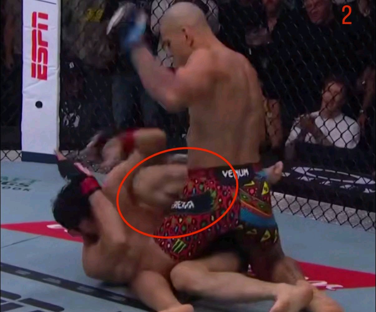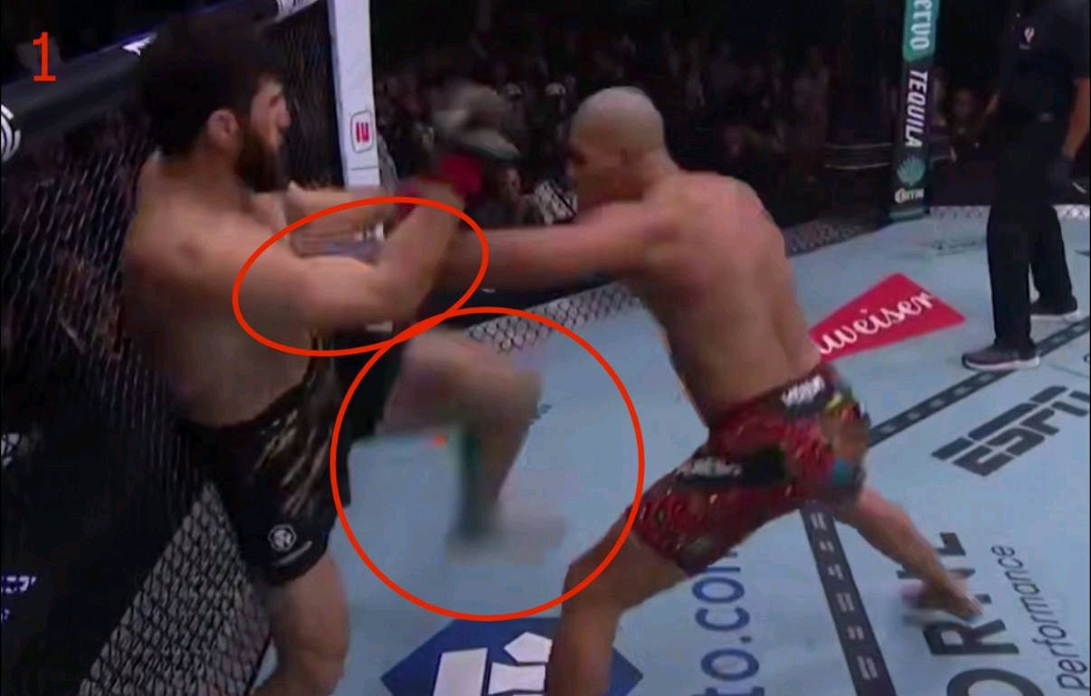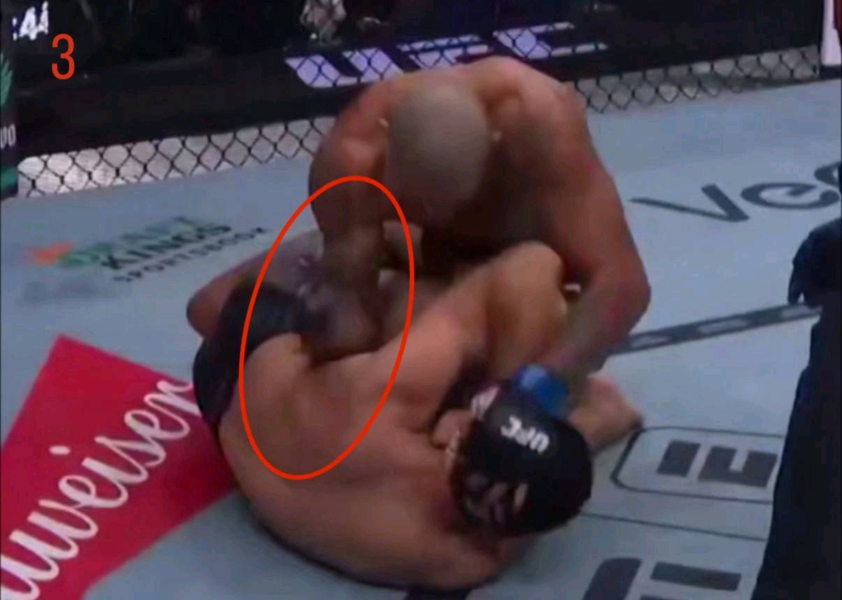 2. при добивании магомед перекрылся, но гляньте, какую часть тела он пытается защитить ногой - это вновь рёбра. пересмотрите этот момент, он прям не отрывает свою конечность оттуда.