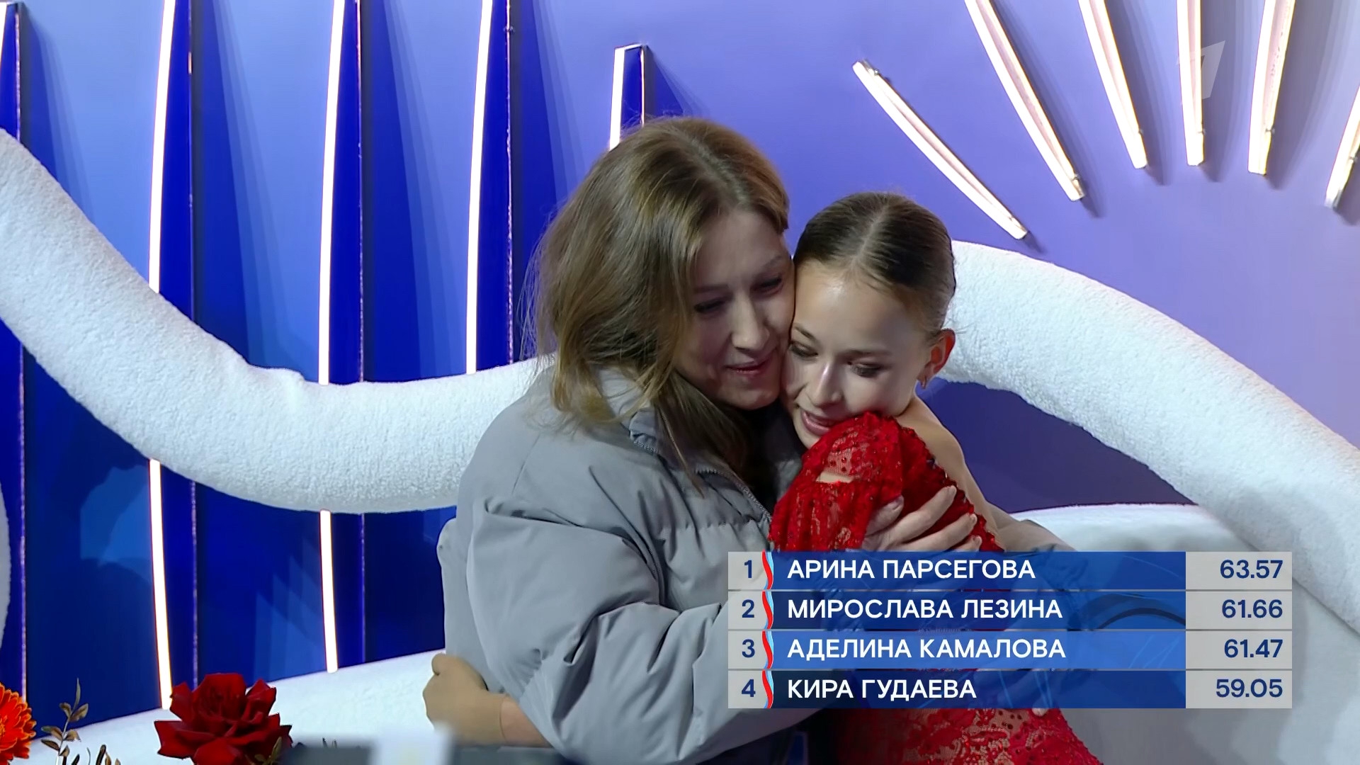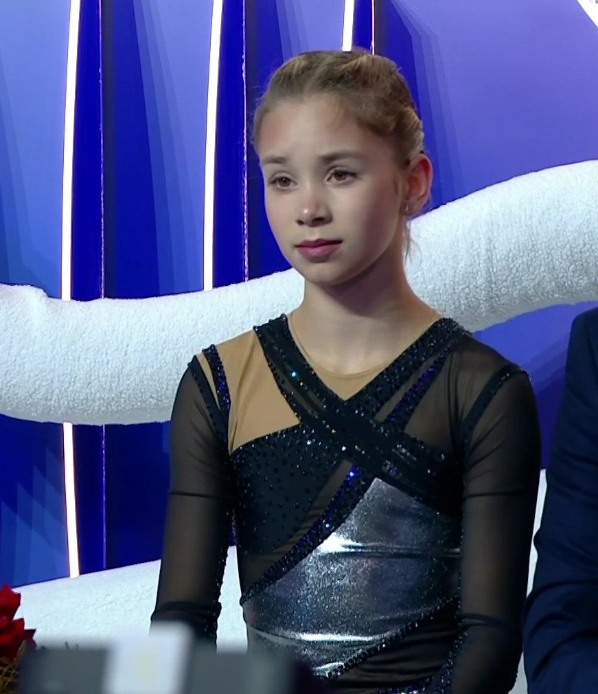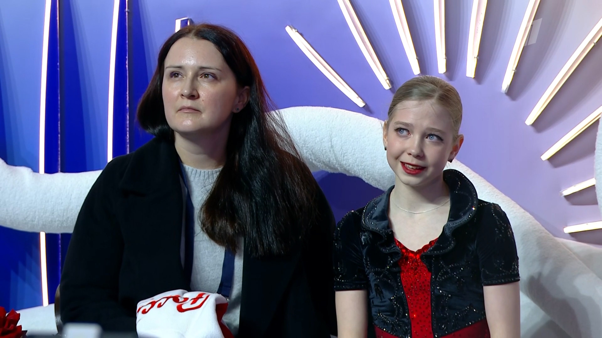 Екатерина Алексеевна КОРЧАЖНИКОВА, с мамой гимнастика на льду очень красивая, на комбинезоне что-то импрессионистское в духе ван-гога звездная ночь 2a в хв 3f 3zq?3t stsq2 бежит на судей перед финальным ccosp4