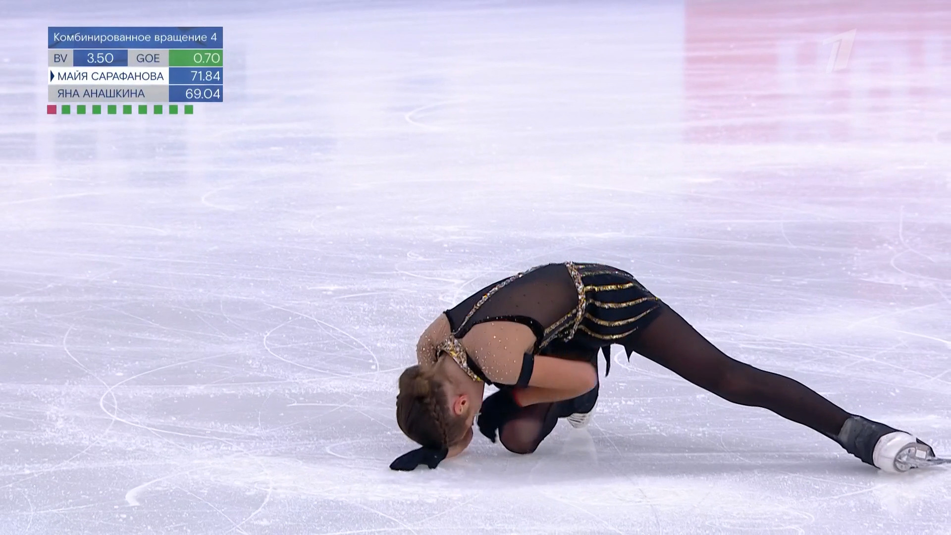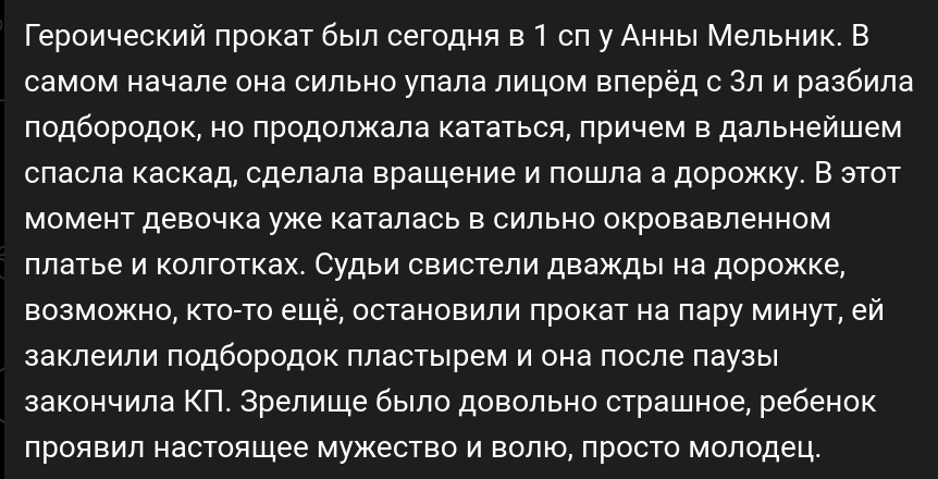 Анна Антоновна МЕЛЬНИК вроде без Царевой 3z< fall на живот, хватается за подбородок 3f симавыезд, закрутило, подталкивание +2t программу остановили. Рассечение?