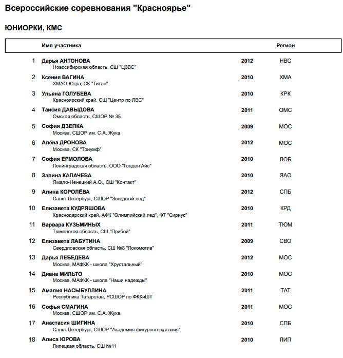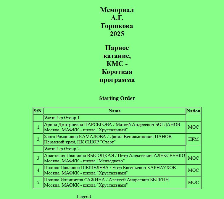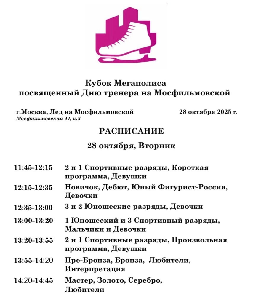 28 октября https://vk.com/video-156759190_456239124 13.35-17.10 – 1 сп., девушки, КП (подготовка льда после 3-й и 5-й разминок) 18.15-19.45 – КМС, юниорки, КП 19.45-20.30 – КМС, юноши, МС, женщины, мужчины, КП