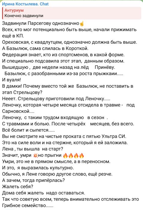 >"У Костылевой прекрасная программа! Между элементами у нее достаточно связок, трудно этого не заметить. Комментатор сказала, что тренерам необходимо подумать о компонентах между прыжками. Не знаю, почему она их не видела. Неприлично говорить о том, что у Лены нет связок. У нее все время идут шаги. Предлагаю гордиться ее выступлением.
