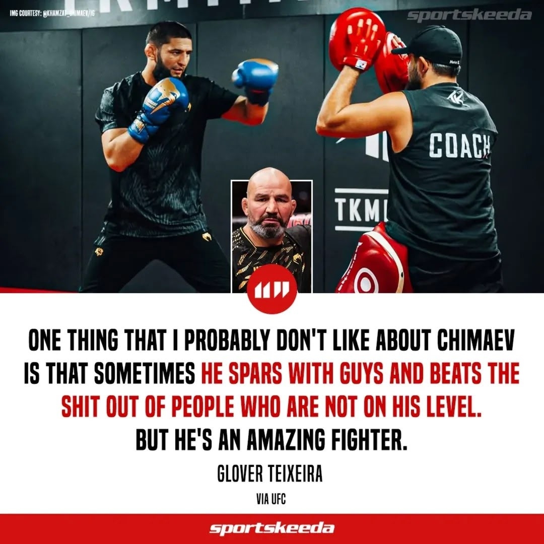 «Хамзат Чимаев потрясающий боец. Мне нравится, как он говорит и отвечает за свои слова. Одна вещь, которая мне в нём не нравится, заключается в том, что иногда в спаррингах он жёстко избивает парней, которые даже не находятся на его уровне. Он выбивает из них все де. Но, как я уже сказал, он отличный боец и хорош у микрофона»