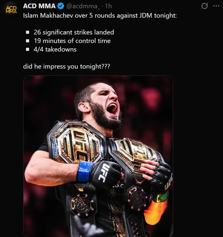 Судьи отдали Махачеву все раунды 50–45. Ислам стал 11-м бойцом в истории UFC, взявшим два пояса, и вторым после Би Джея Пенна, кому покорились лёгкий и полусредний вес.