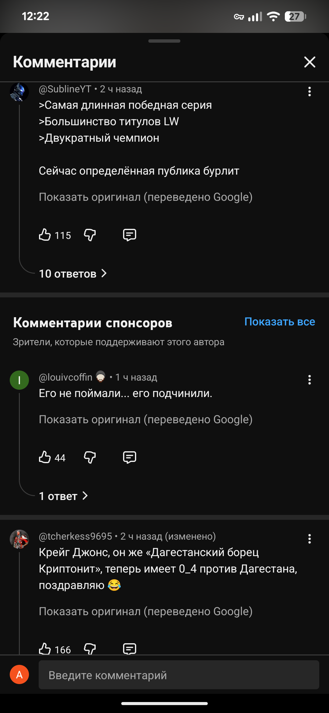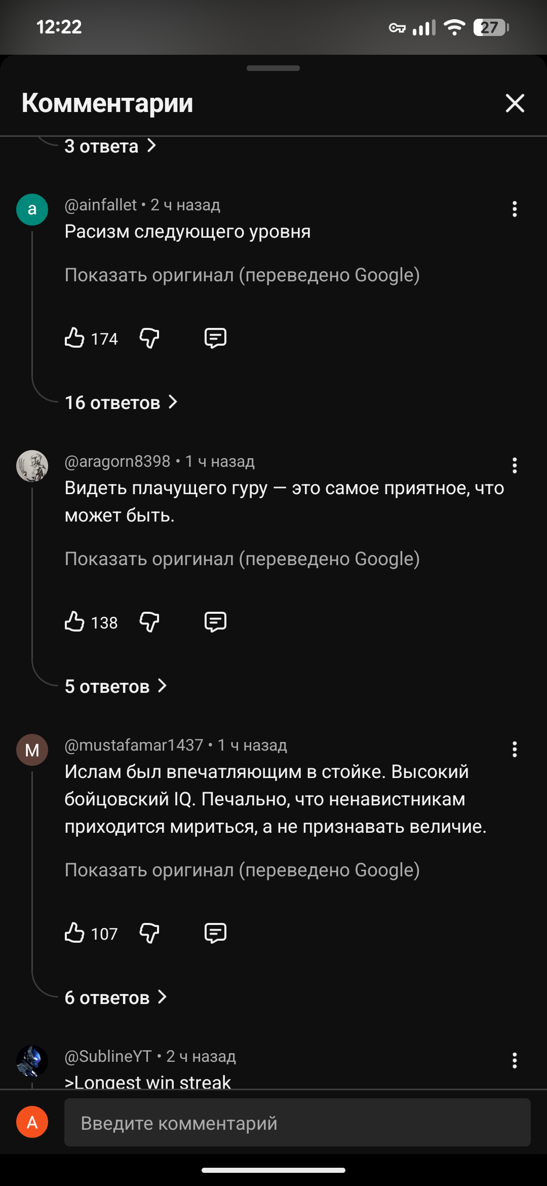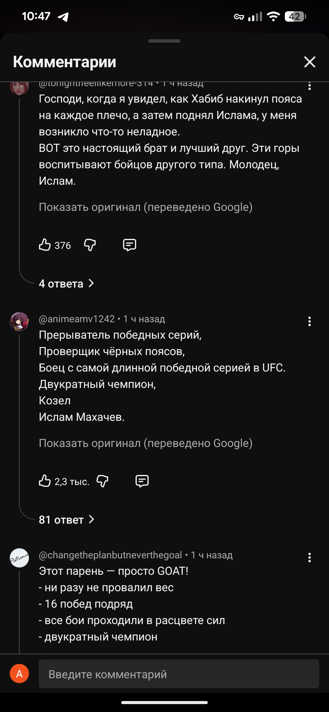 Почему только от русских читаю, что бой недостойный? Зайдите в англоязычный аккаунт в Инстаграме, или в Ютуб. Все хвалят Ислама, поздравляют. И только Ваньки в ВК или телеграмме пишут, что чемпион ненастоящий и что бой дерьмо. Найдите любой хайлайт матча на Ютубе, все комментарии восторг и поздравления. И только русские чем то недовольны. Он россиянин, всегда дрался под флагом России. Много гнили в вас, друзья. Зайдите так же после боя русского в любую группу про UFC в ВК и прочитайте комментарии. Другие нации всегда радовались за Яна, за Волкова. И только вы проявляете нацизм чистый