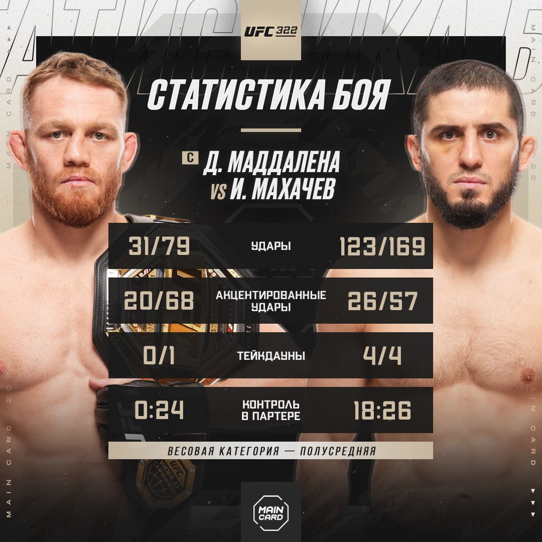 В Нью-Йорке завершился UFC 322. В главном событии вечера подтвердилось то, о чём мы говорили задолго боя — про дыры в защите, про оппонента ниже классом и то, что этот поединок ничто иное, как оперативная комбинация Хабиба и Али Абдельазиза. Ислам Махачев не просто победил Джека Делла Маддалену. Он провел в октагоне почти лабораторный разбор слабейшего чемпиона за всю историю полусреднего дивизиона, которого завтра никто не вспомнит.