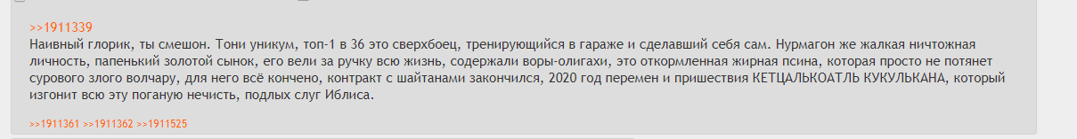 Я нахуй с первого дня его чемпионства говорил что это дутая хуйня, махачев его прожует и не заметит. А ты всё кукарекал казуваааалы казуваалы выв ммане шарите. Этого чмошника Бёрнс как собаку пиздил пока на закидуху не нарвался. Открывай рот я целый год ради тебя мочу копил.