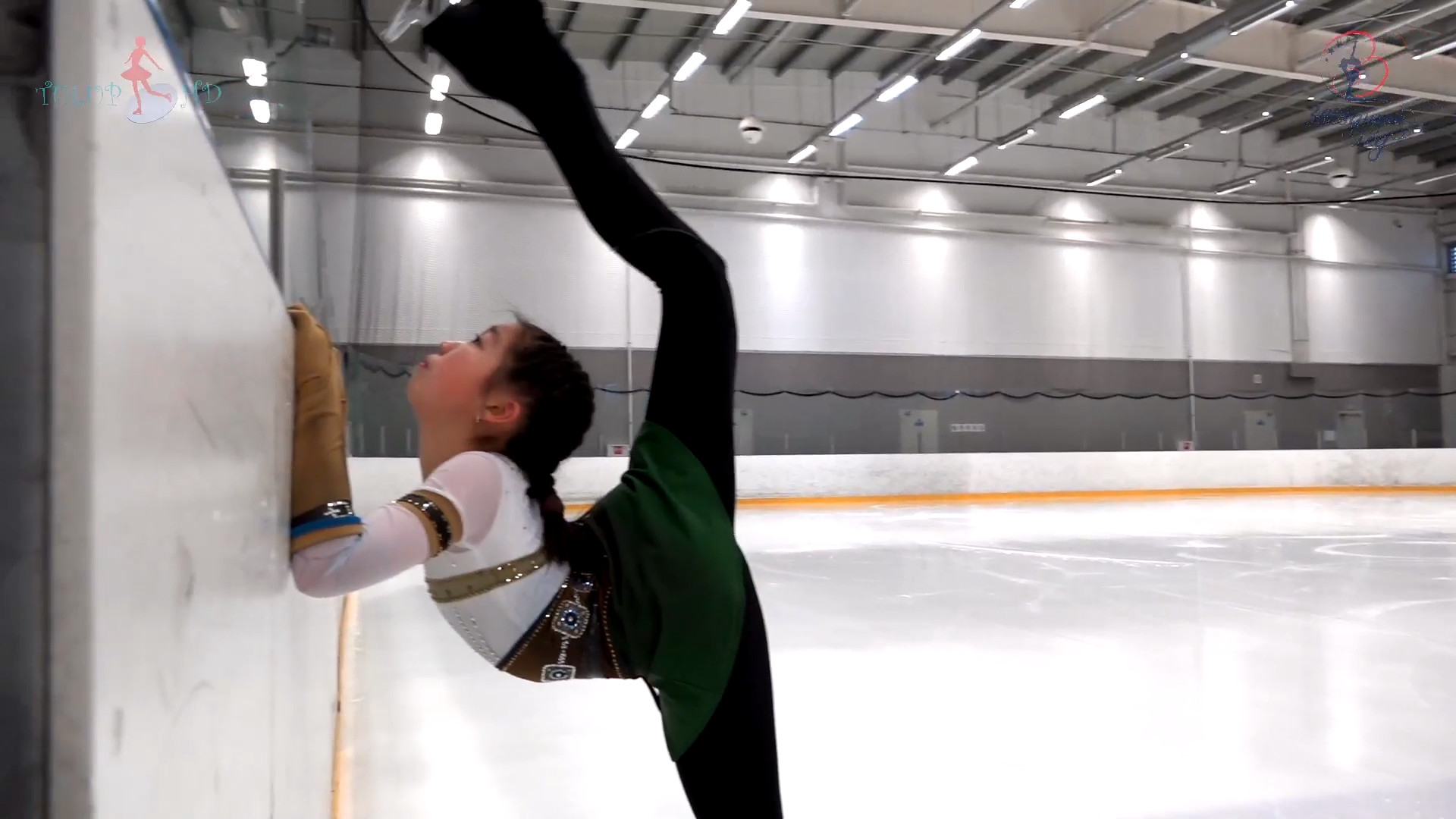 Варвара Андреевна КОНДРАТЬЕВА с А.Ю. разминается в куртке >дум-тек! 3s >i wanna dance! 3z!3t<< завалилась назад на 45 градусов, fall на спину, больно очень 3f!?q? прыжок в шпагат 3z!2a2aq 3f!?<2t 3r свистит chsq1