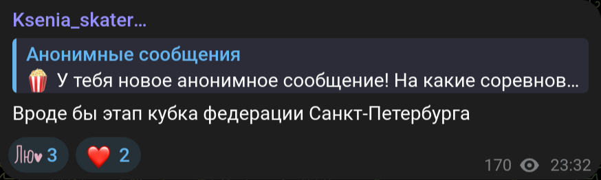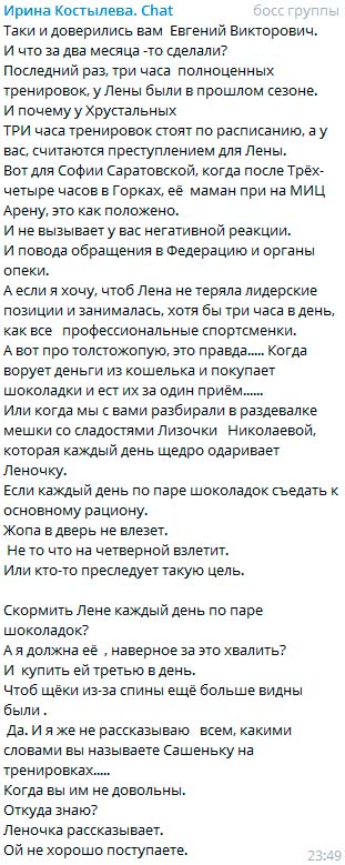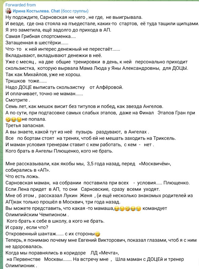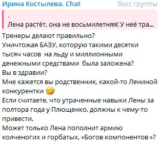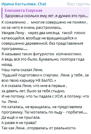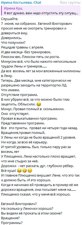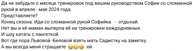 P.S.: Меня тоже мама в детстве пыталась тренировать и считала, что она больше Мишина всё знает, и только когда она полностью доверилась моему тренеру, только тогда я выиграл свой первый Чемпионат Мира. Паника из-за 2 места на Гран-при, зная, в какой ребенок травме - это как минимум странная реакция, тем более зная, что стоит за 1 местом в Москве и за 2 местом в Омске, тем более давая направо и налево всем СМИ интервью о травме Лены. ✍️Соцсети Евгения Плющенко