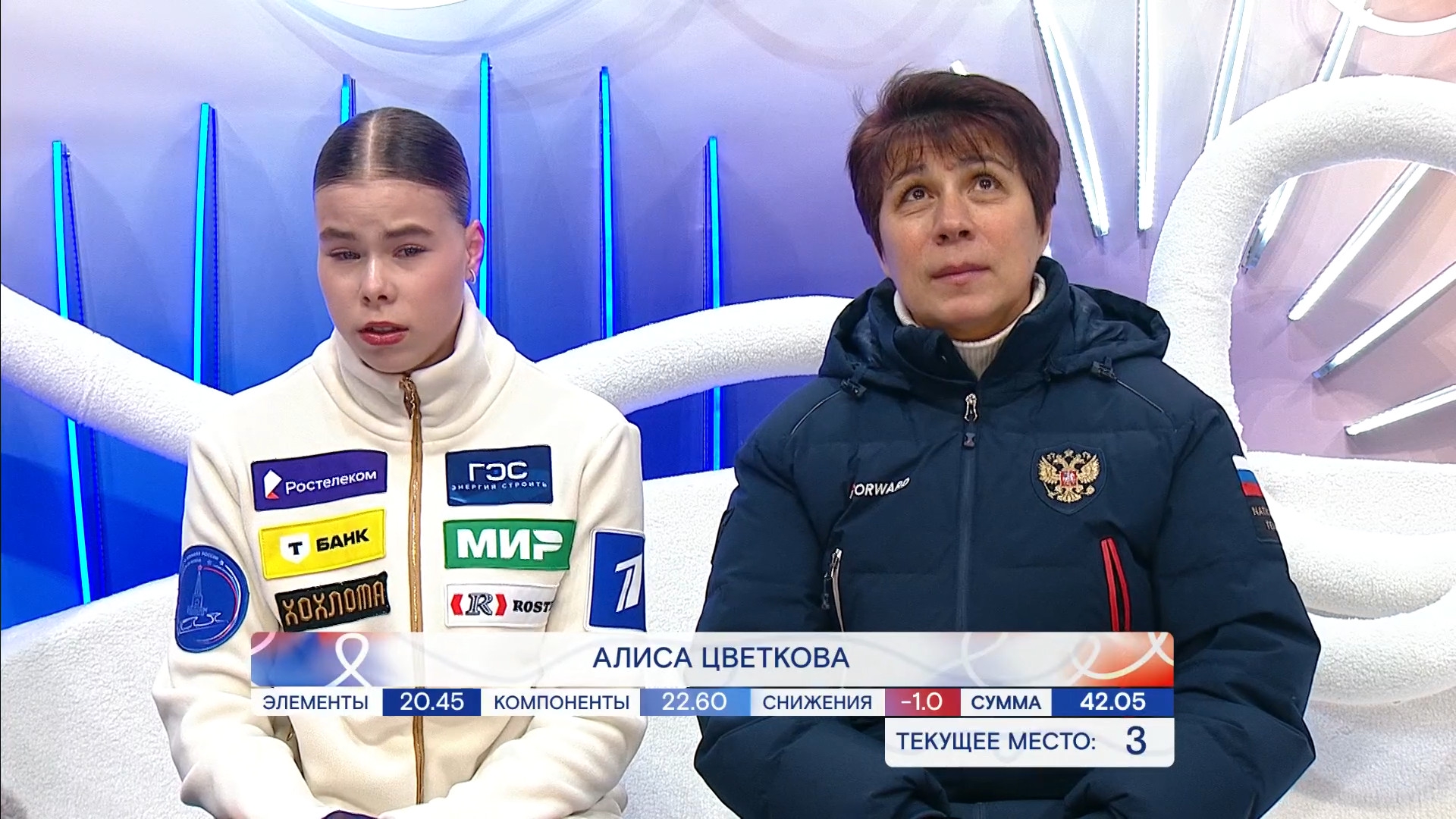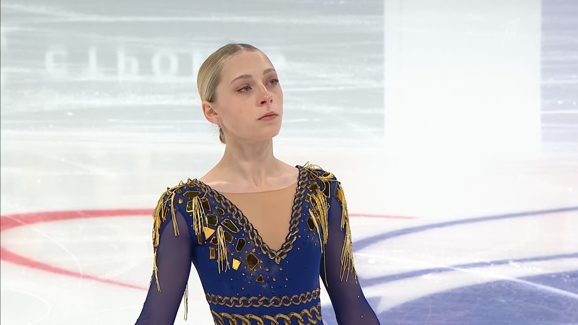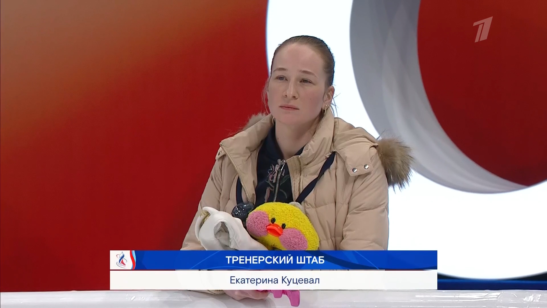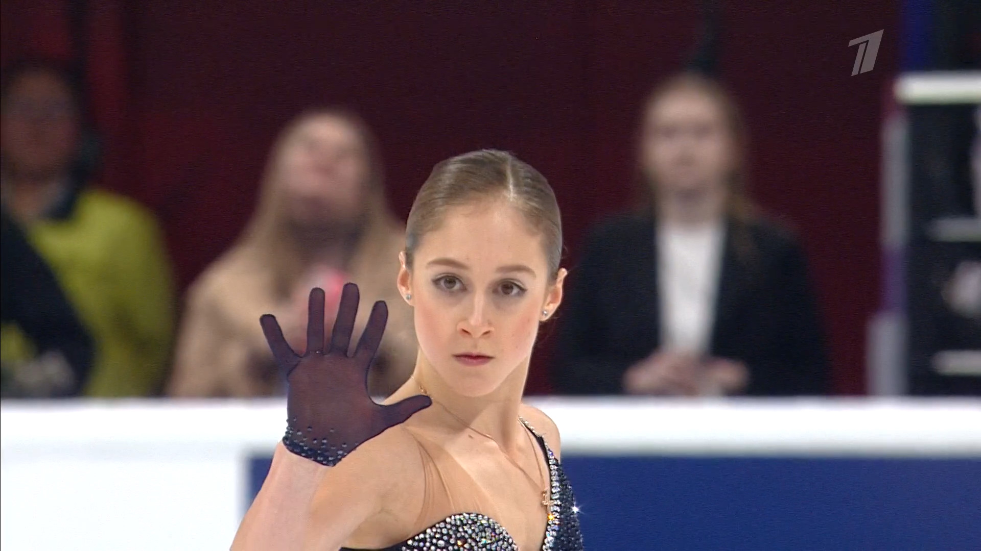 Дарья Денисовна ЦАРЕГОРОДЦЕВА с Самодуровой и в куртке 1 канала шуршит рёбрами на весь каток 3a<<? fall 3z3t в твизлы держась рукой за конёк 3r в хв chsq1 3s 3z! тройка (немой вскрик на лице в этот момент) 2a2a 3f3t ho
