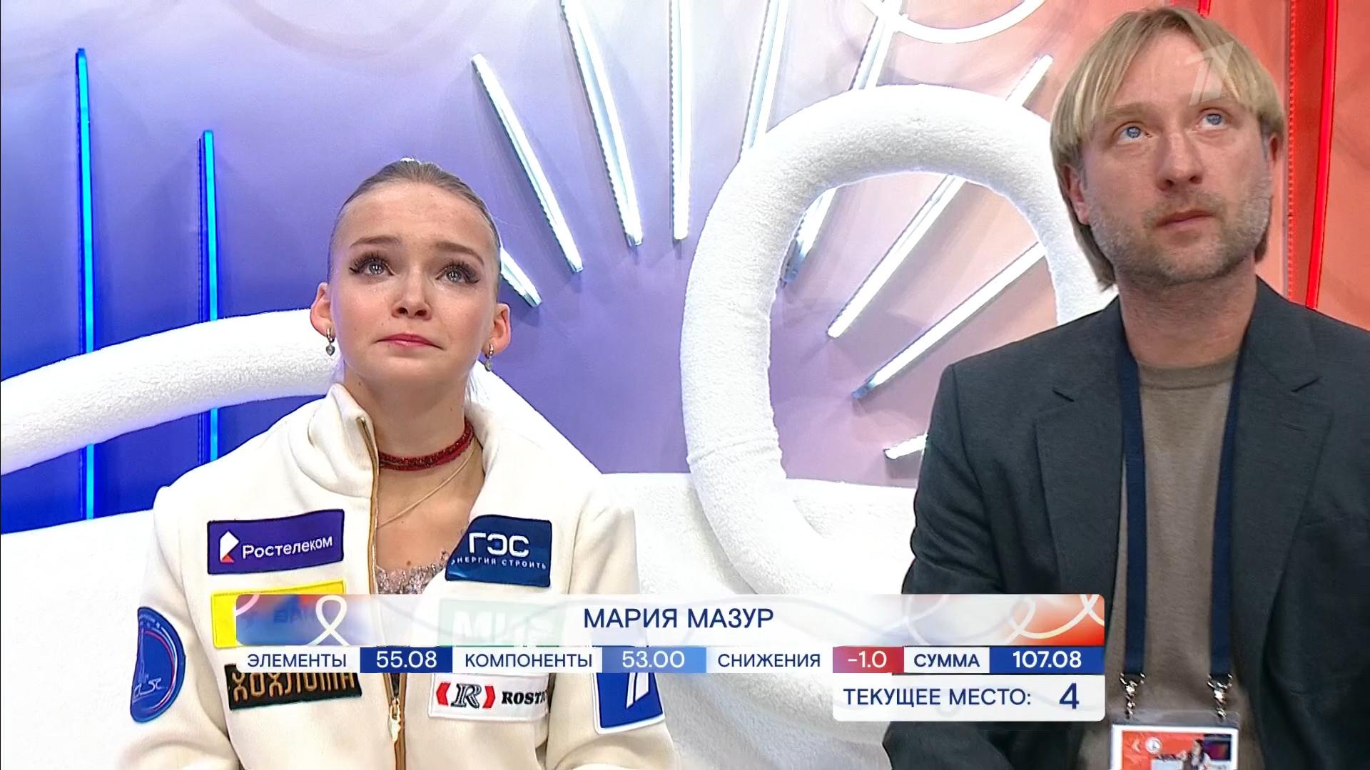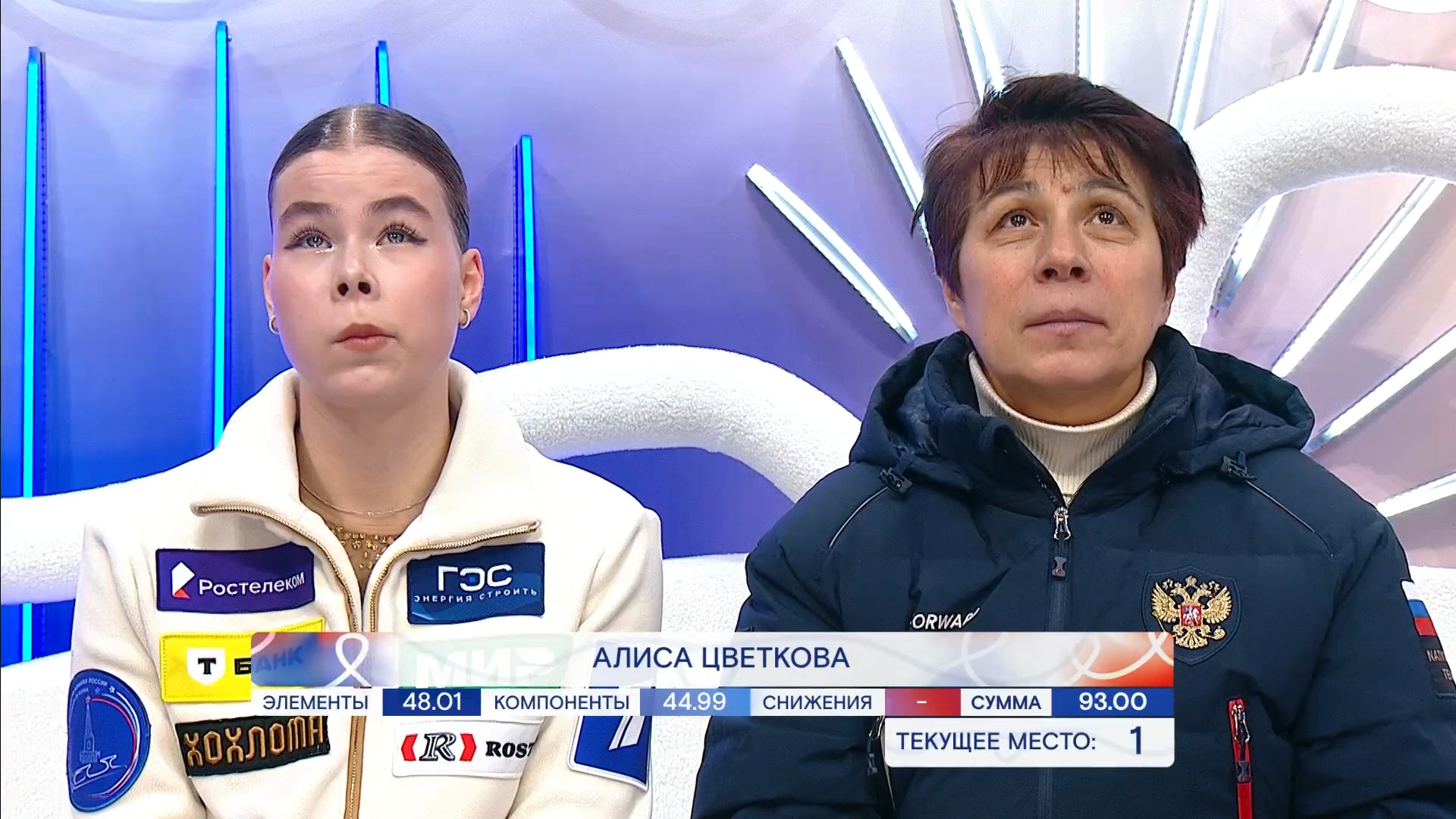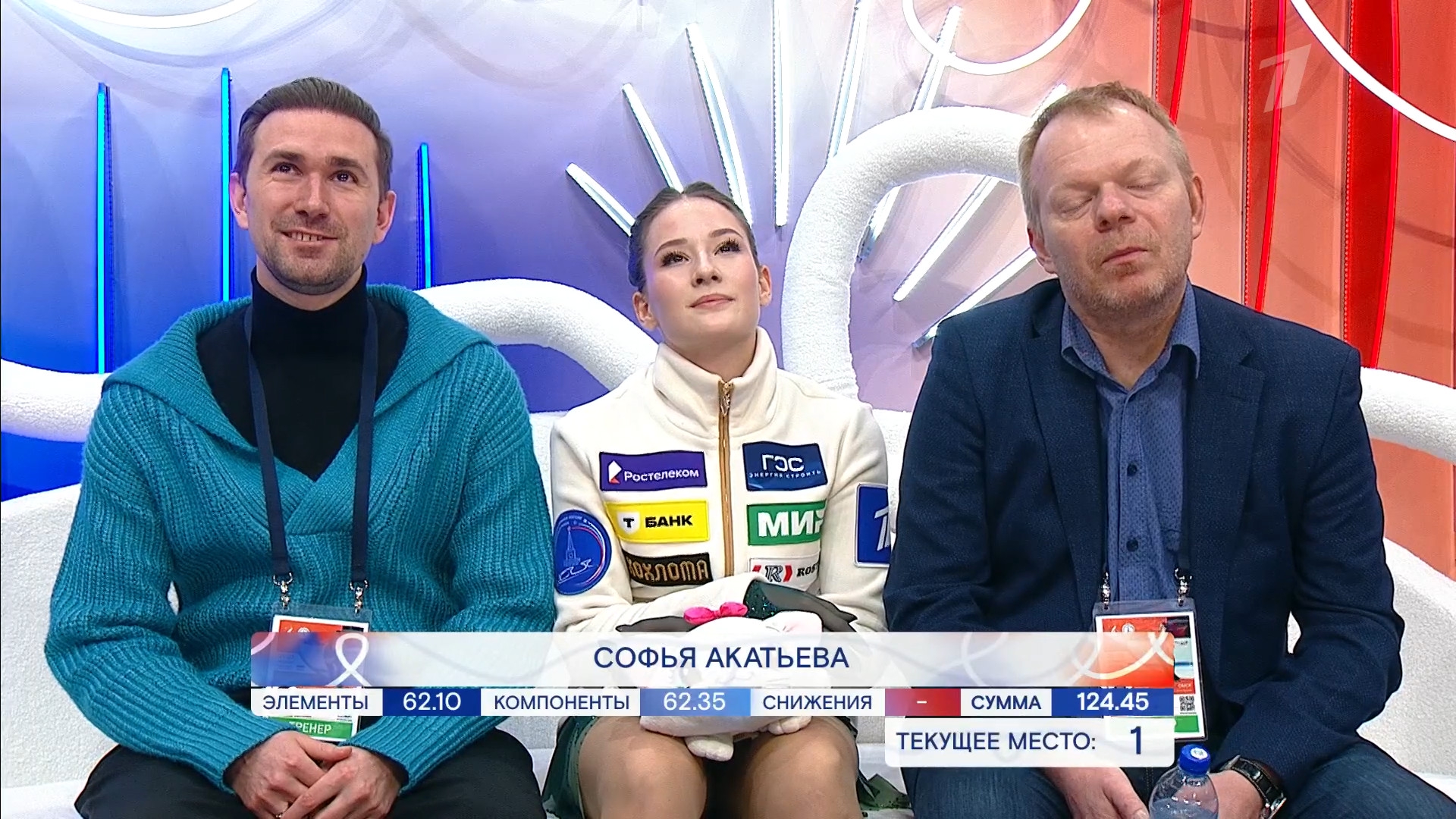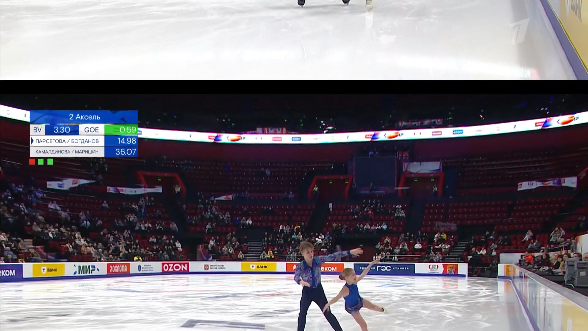 Дарья Денисовна ЦАРЕГОРОДЦЕВА с Самодуровой и в куртке 1 канала шуршит рёбрами на весь каток 3a<<? fall 3z3t в твизлы держась рукой за конёк 3r в хв chsq1 3s 3z! тройка (немой вскрик на лице в этот момент) 2a2a 3f3t ho