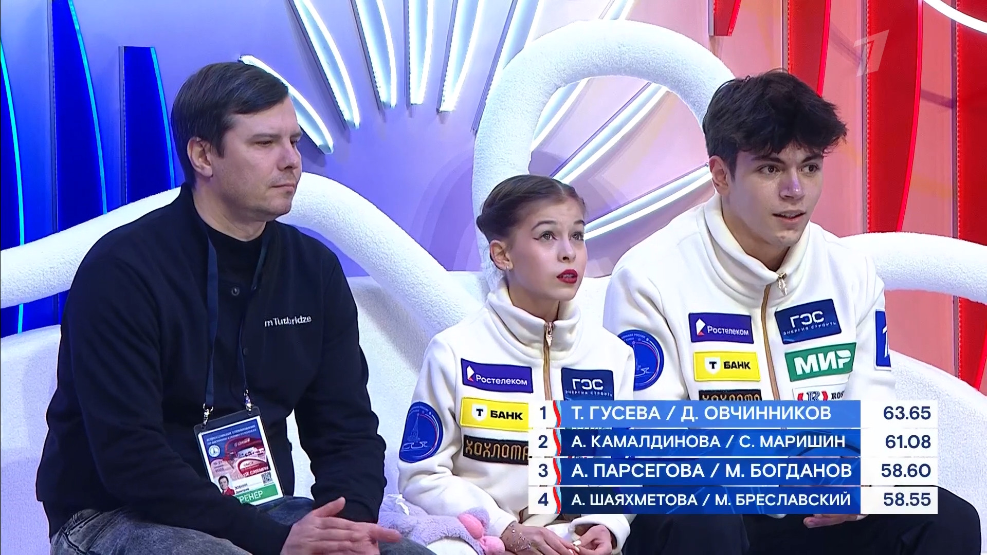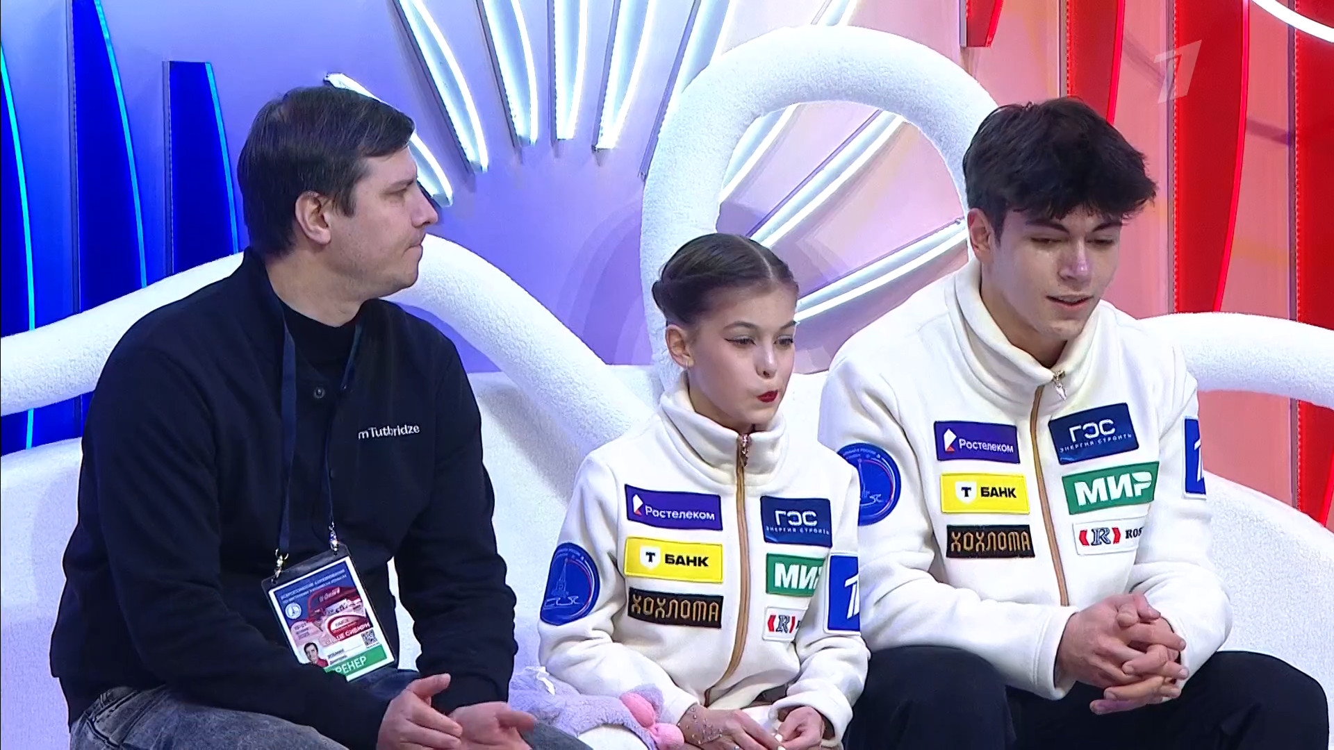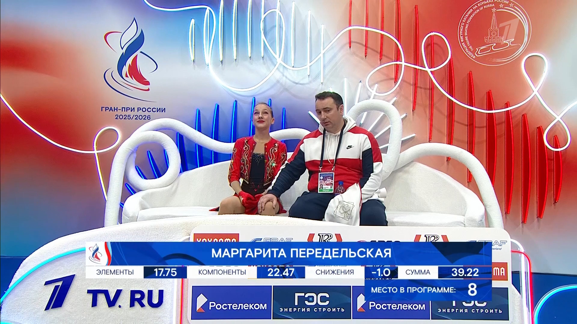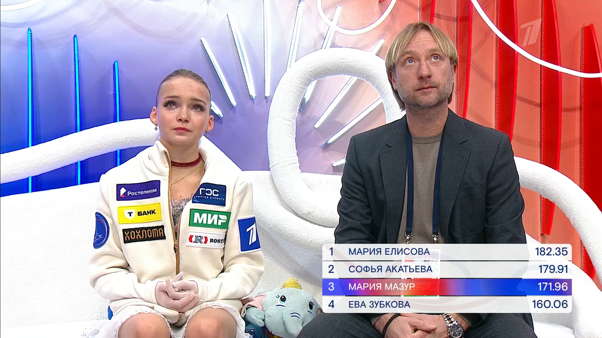 Дарья Денисовна ЦАРЕГОРОДЦЕВА с Самодуровой и в куртке 1 канала шуршит рёбрами на весь каток 3a<<? fall 3z3t в твизлы держась рукой за конёк 3r в хв chsq1 3s 3z! тройка (немой вскрик на лице в этот момент) 2a2a 3f3t ho