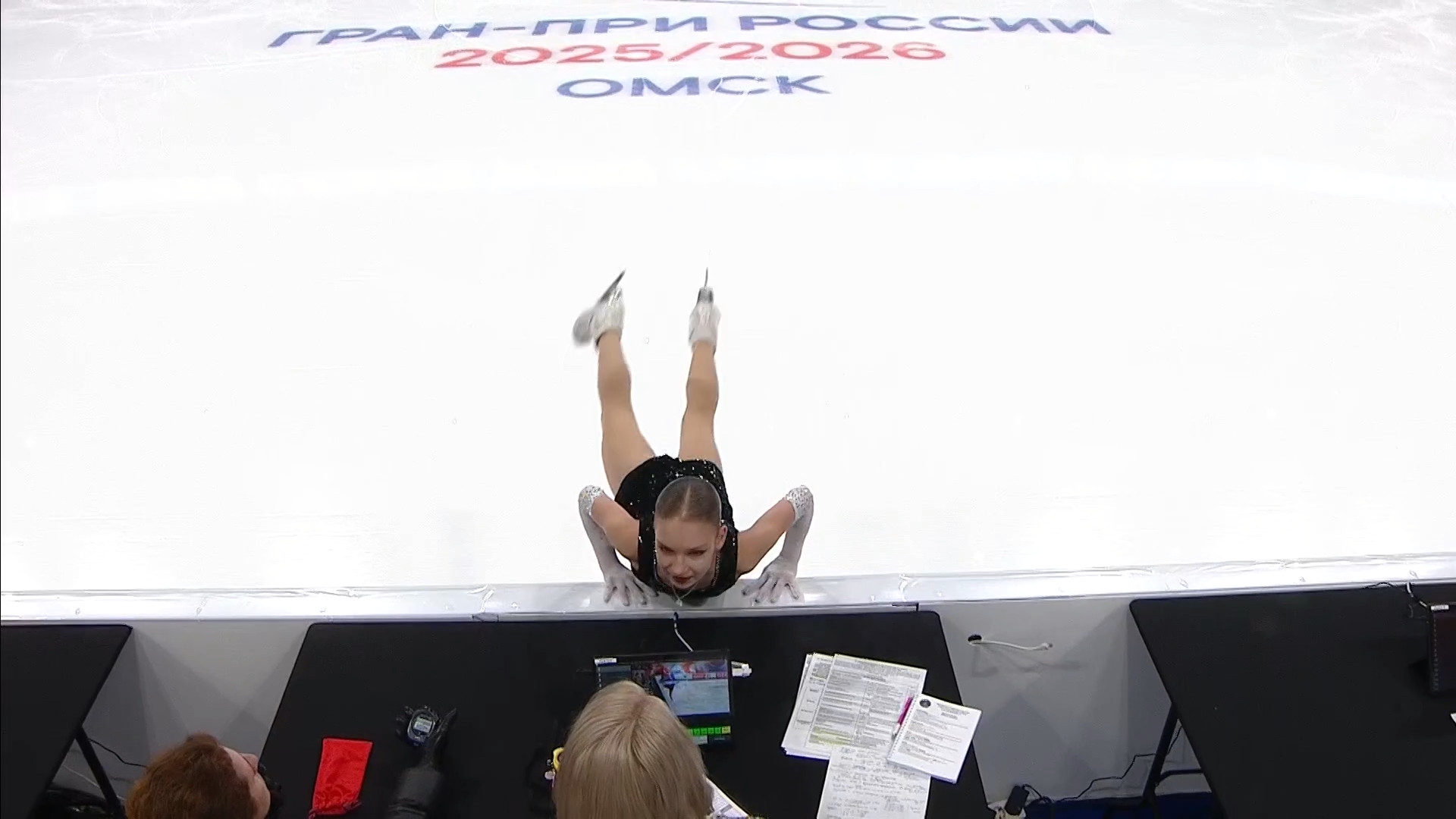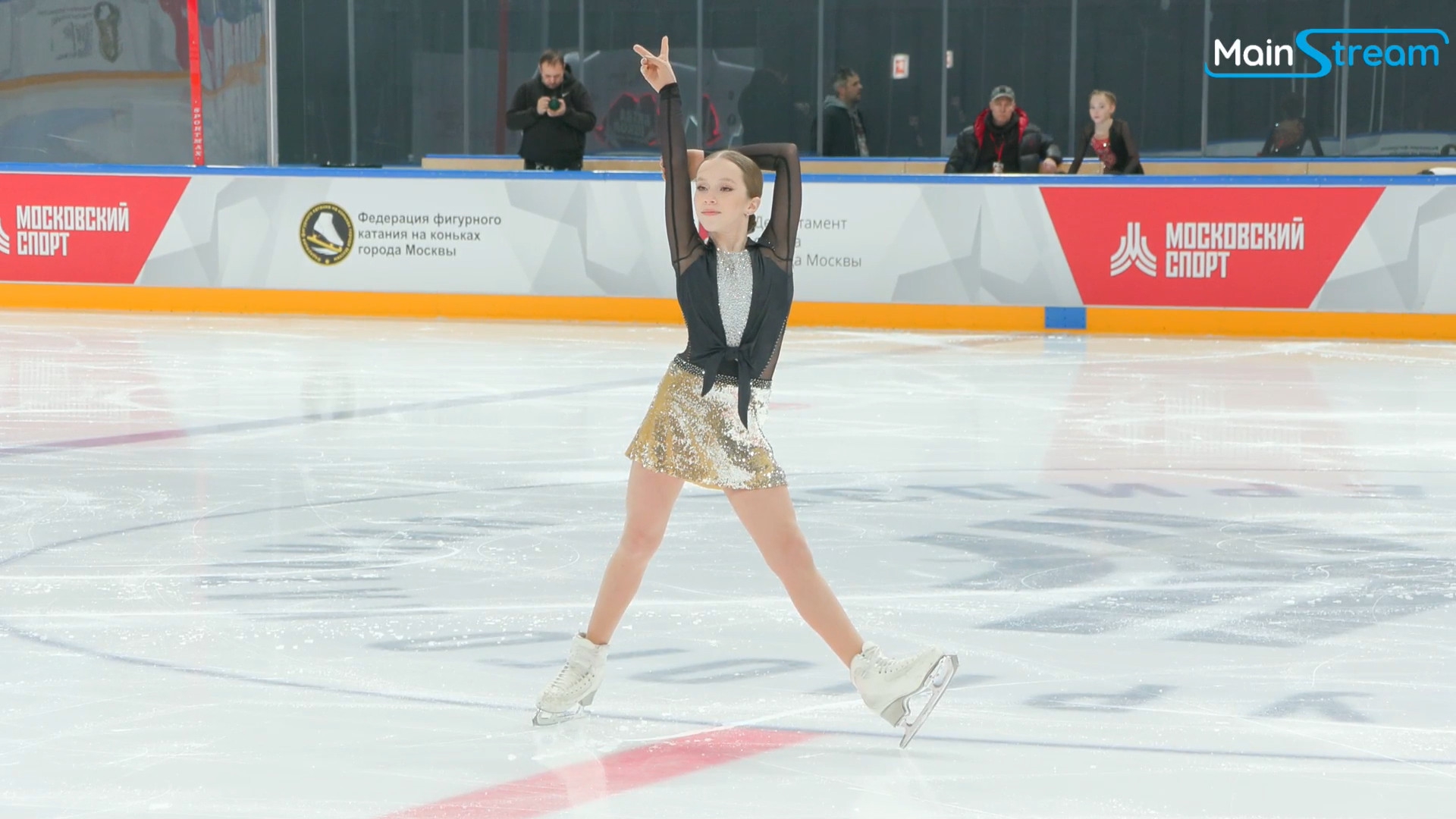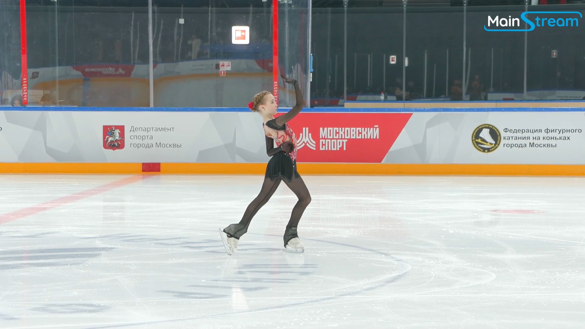 Полина Алексеевна БЕРШАДСКАЯ 2a с гидроблейда в кораблик, в кораблике бросает взгляд на судей, выезд в дрыг 3f со слайда 3z3t с бести в подпрыжку танцует на зубчиках на дорожке, прыжок в шпагат, спотыкается на твизлах