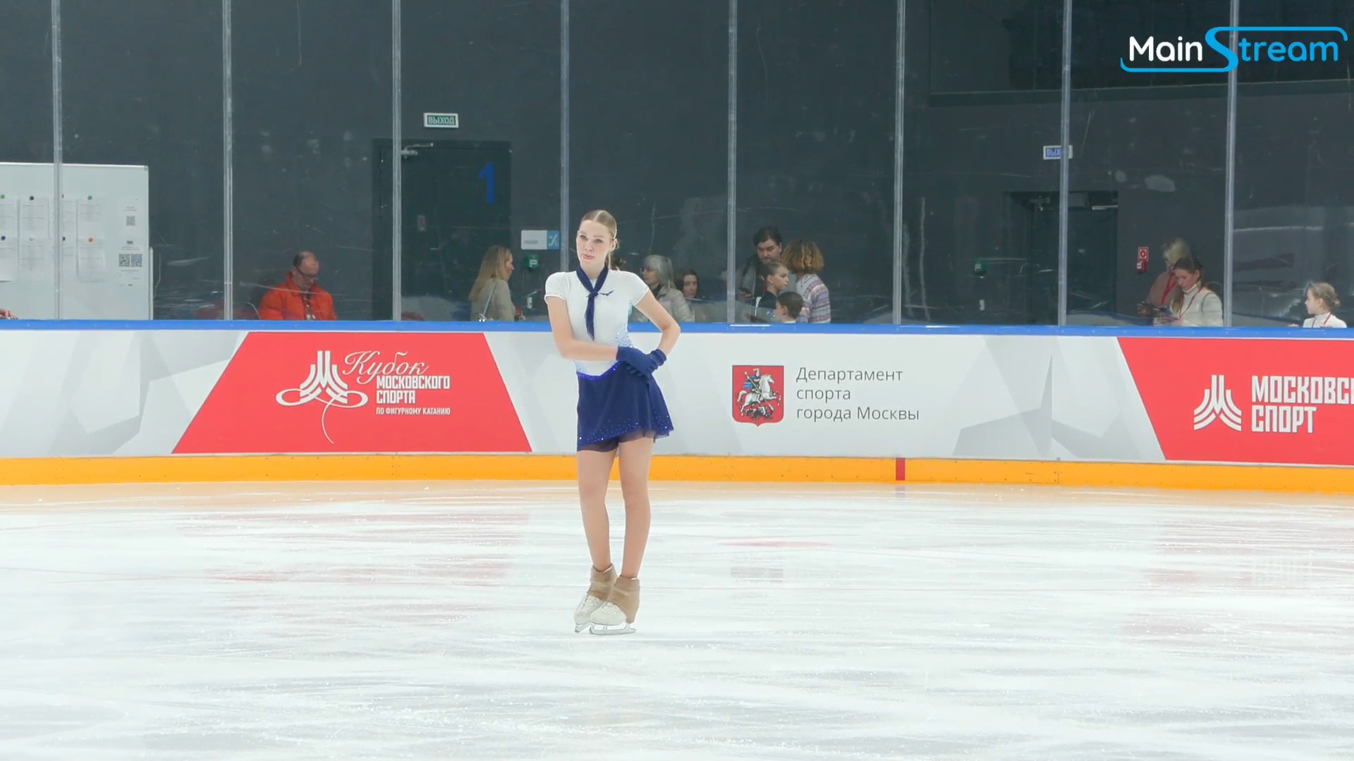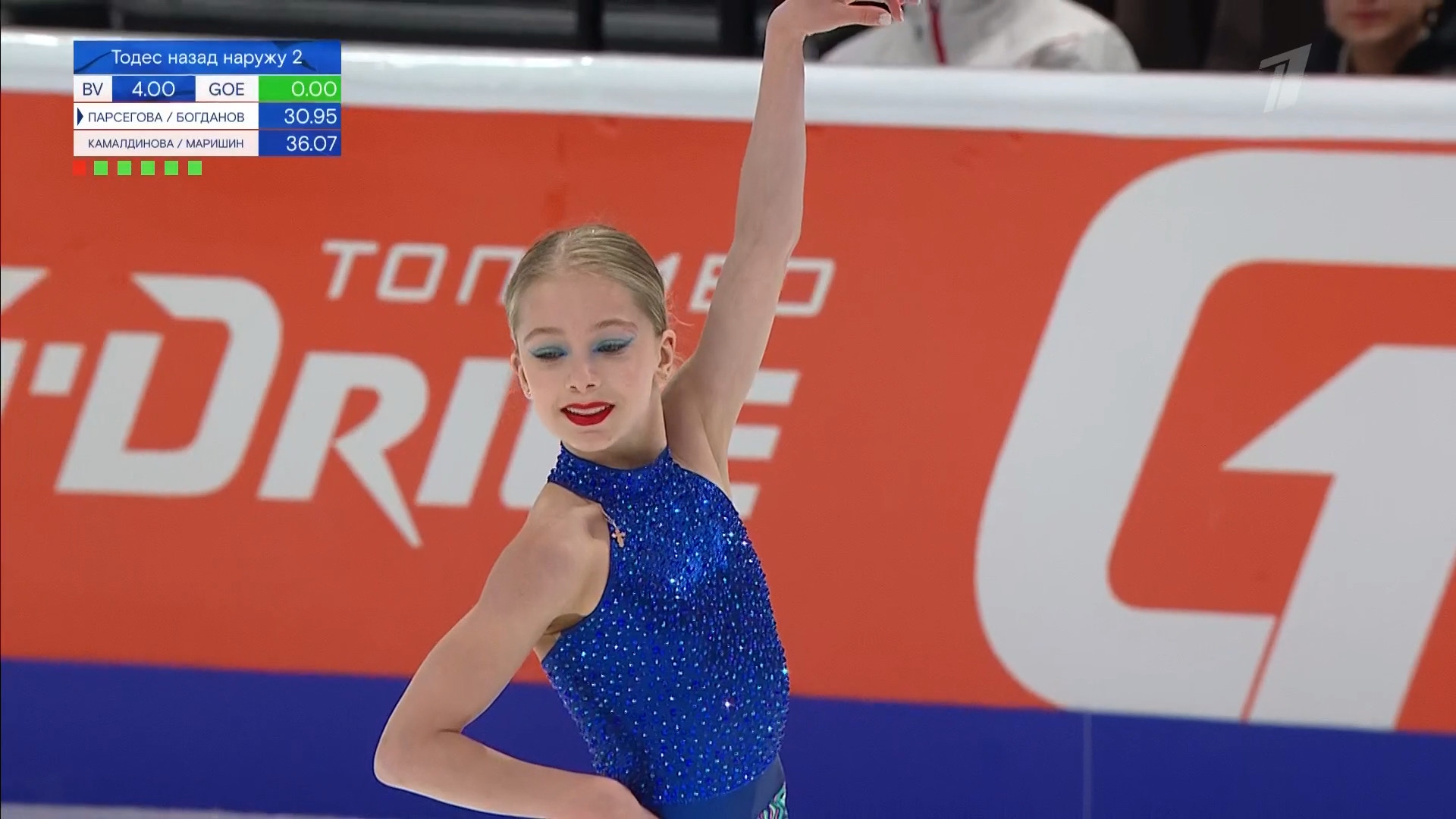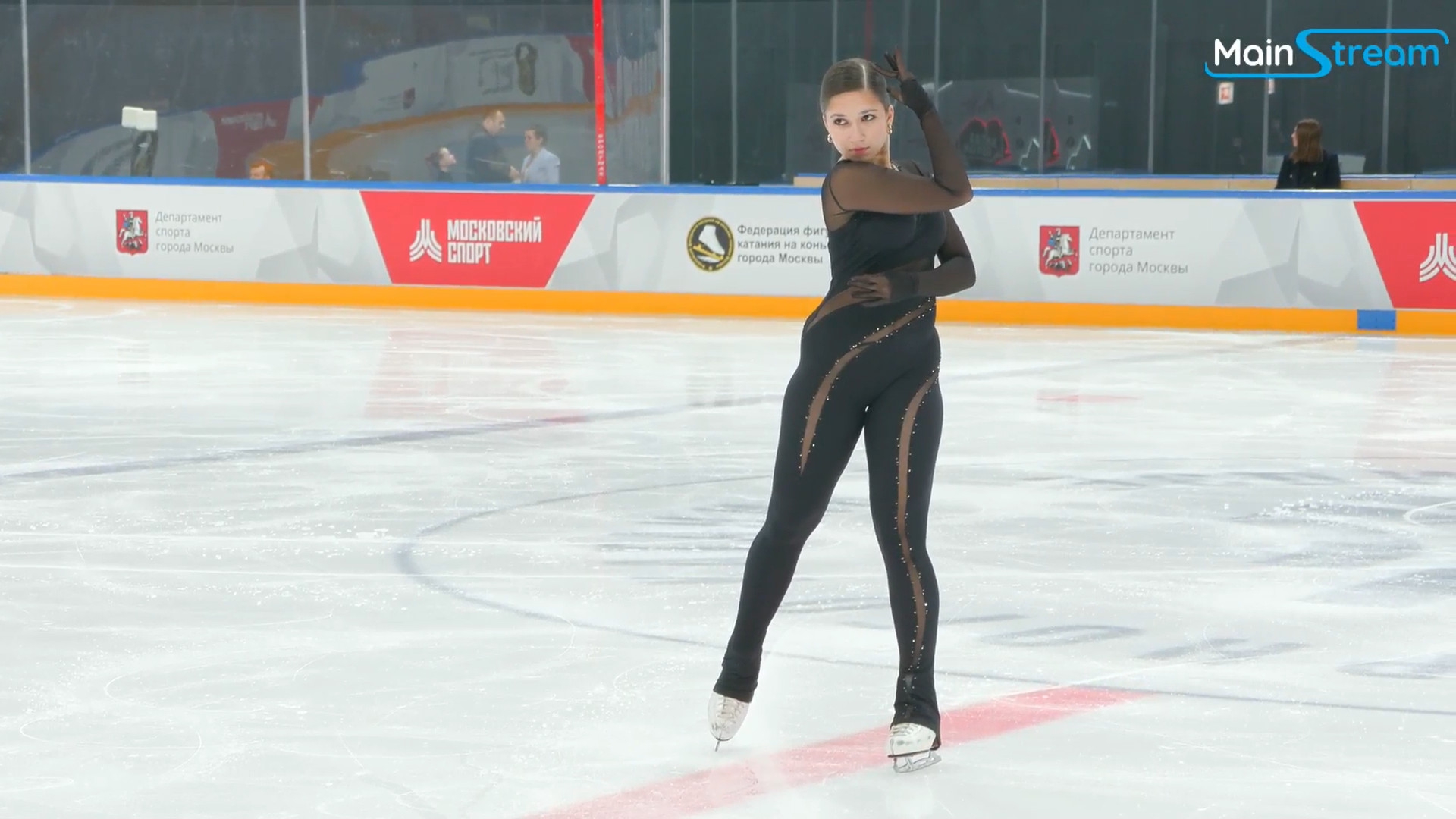 Полина Алексеевна БЕРШАДСКАЯ 2a с гидроблейда в кораблик, в кораблике бросает взгляд на судей, выезд в дрыг 3f со слайда 3z3t с бести в подпрыжку танцует на зубчиках на дорожке, прыжок в шпагат, спотыкается на твизлах