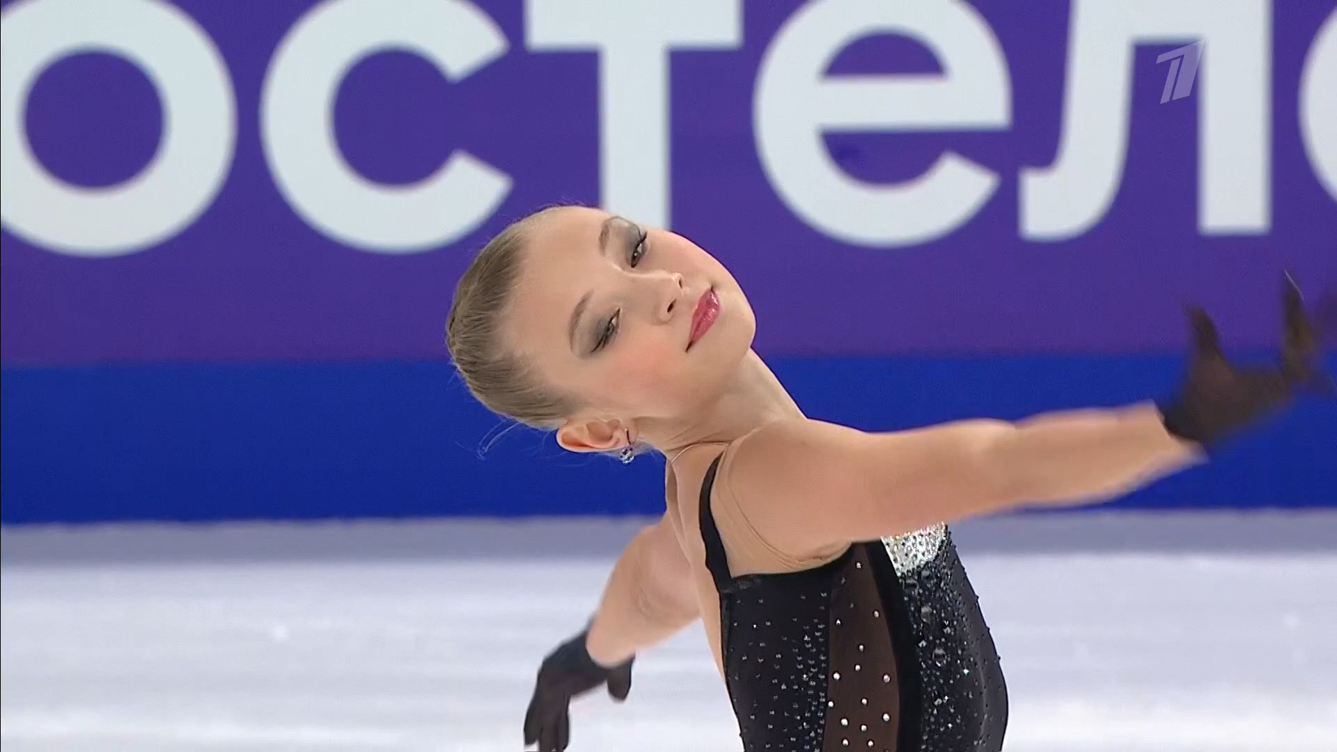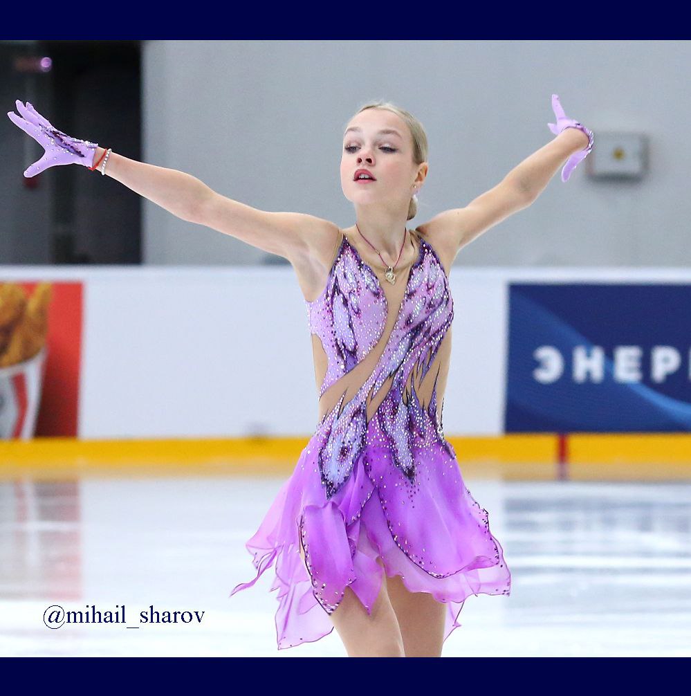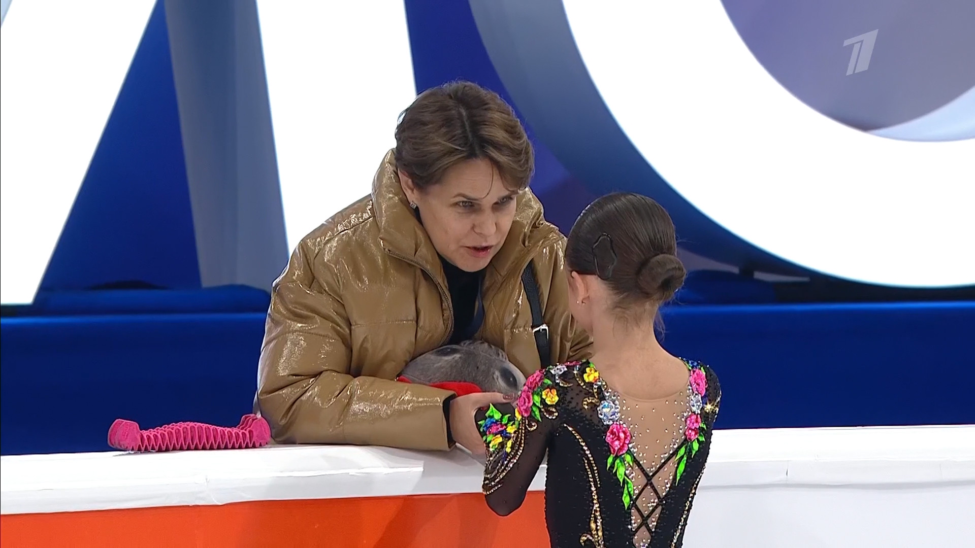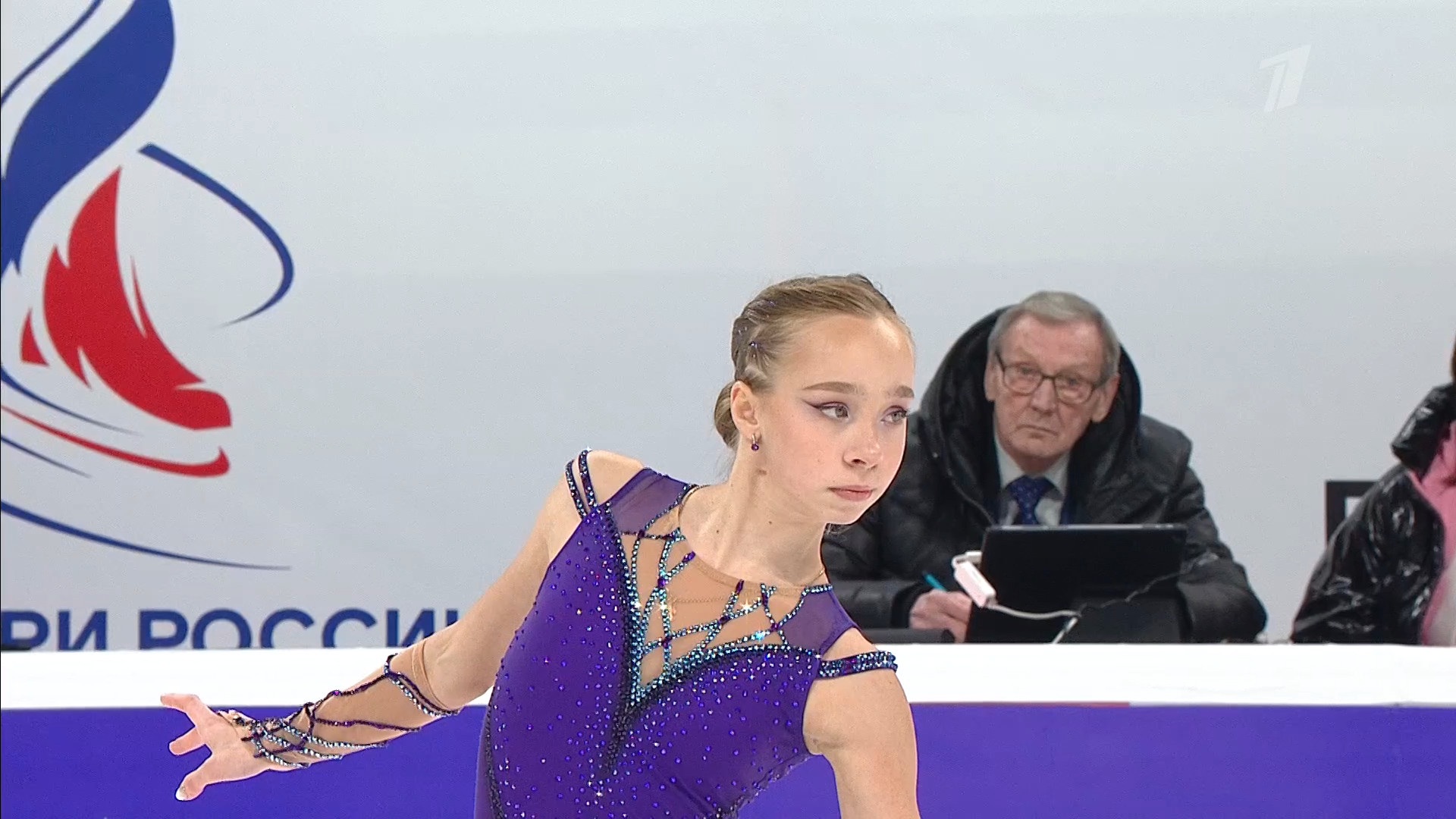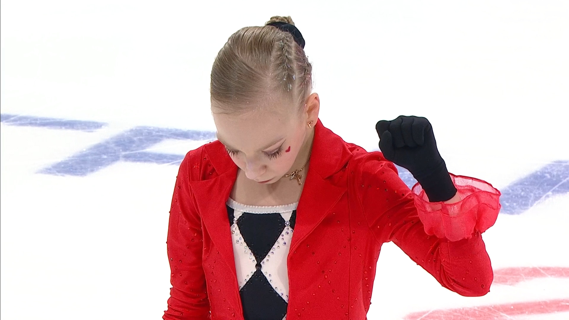 Милана Александровна ПУШКОВА швырнула чехлы под ноги тренеру, ей пришлось нагибаться, поднимать. 2a< 3s<< в подпрыжку, одноножный stsq уровня юный фигурист с подпрыжкой в шпагат 2z2r не успела? оставила приятное впечатление.