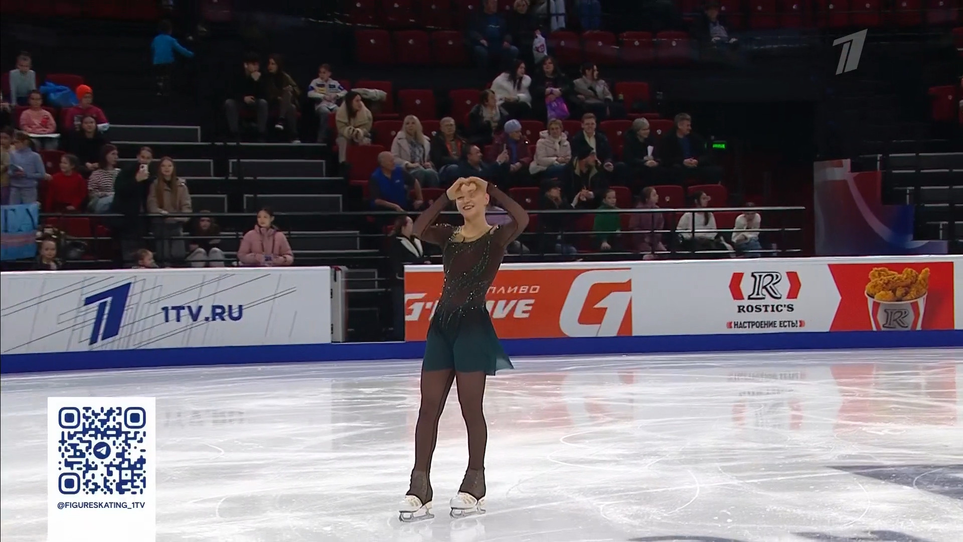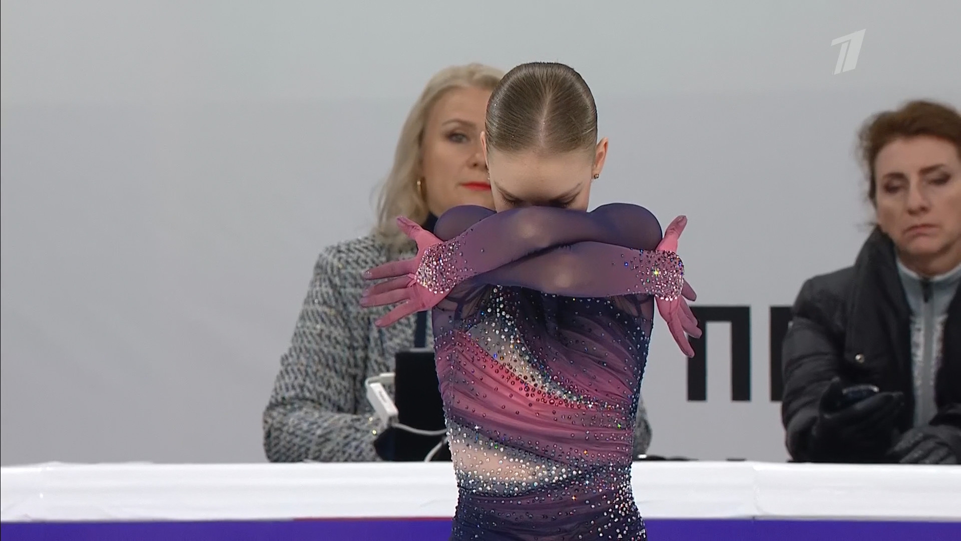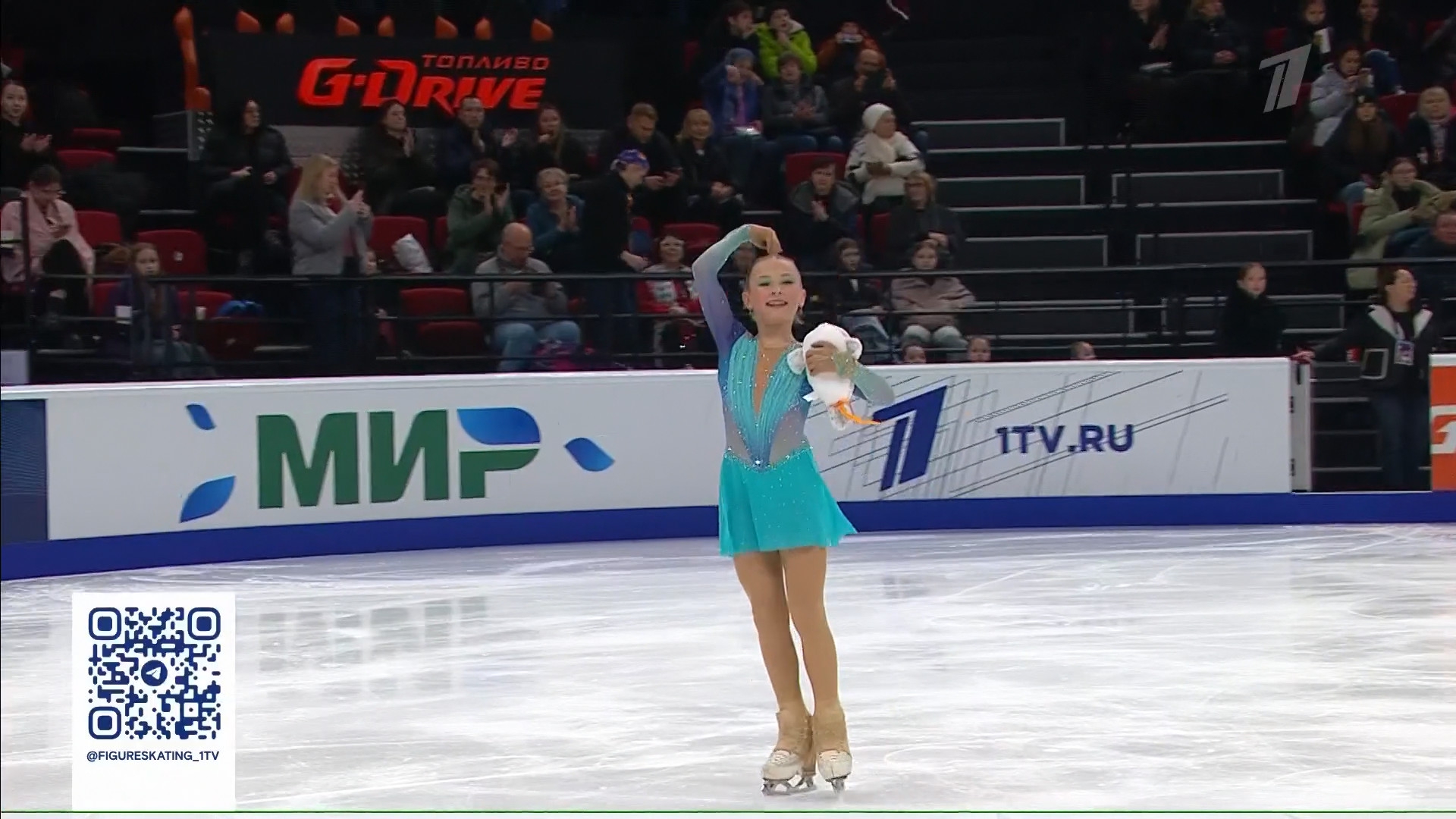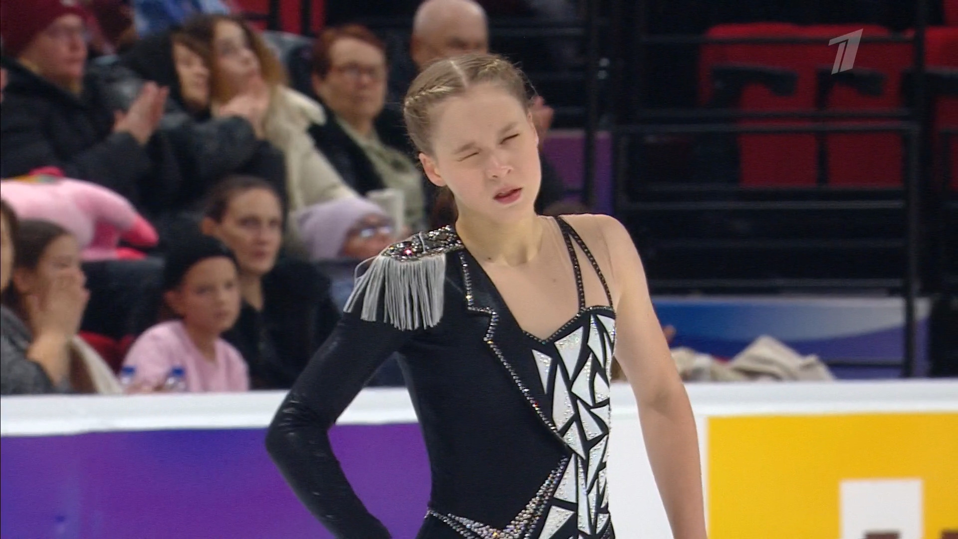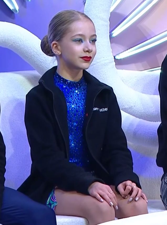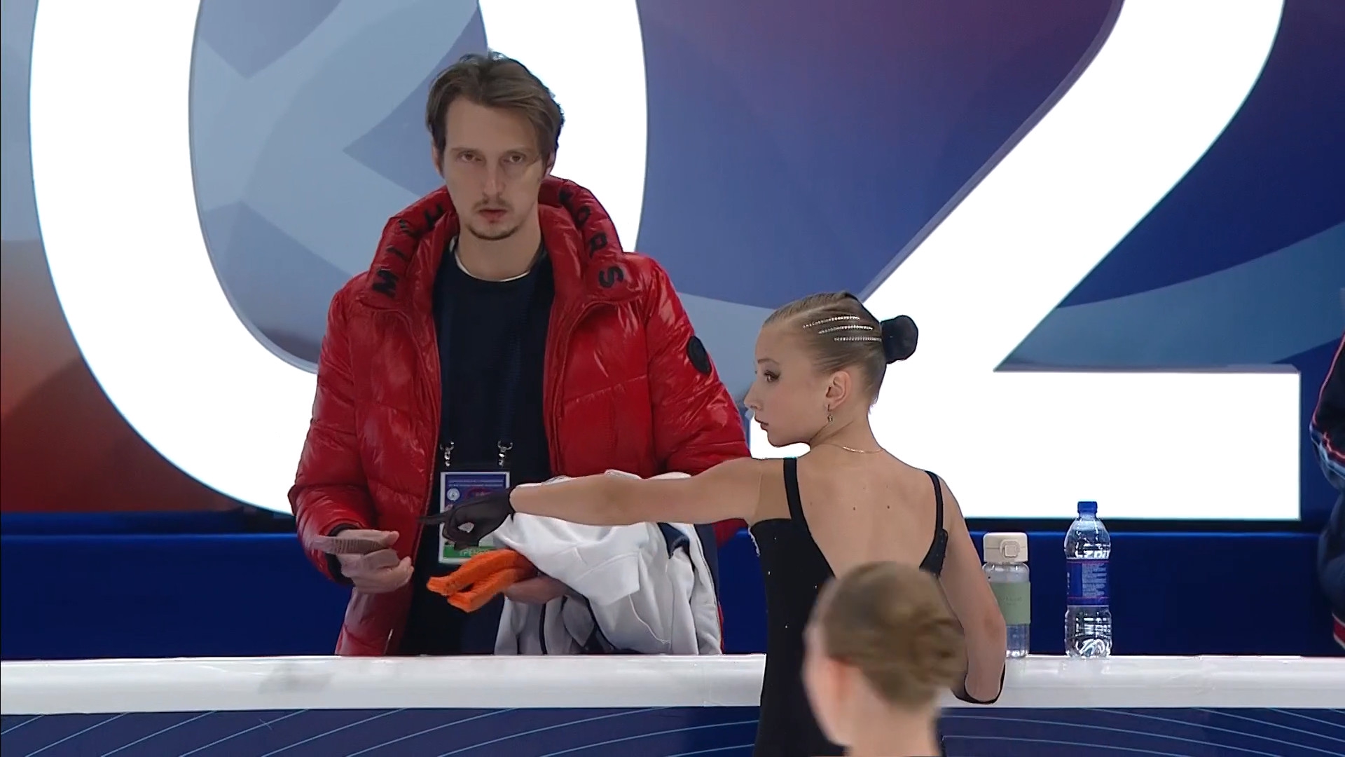Милана Александровна ПУШКОВА швырнула чехлы под ноги тренеру, ей пришлось нагибаться, поднимать. 2a< 3s<< в подпрыжку, одноножный stsq уровня юный фигурист с подпрыжкой в шпагат 2z2r не успела? оставила приятное впечатление.