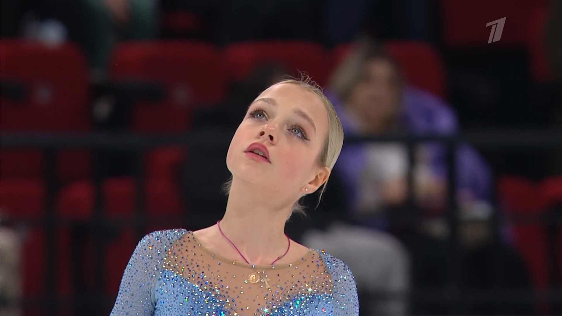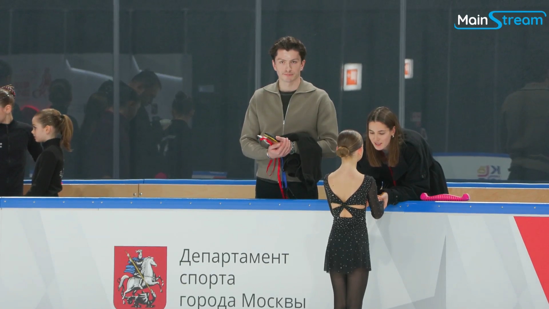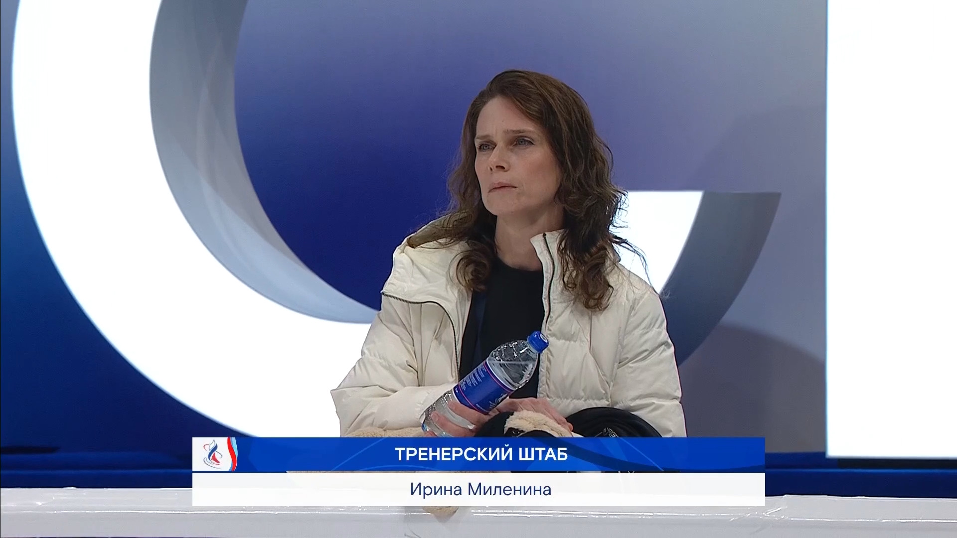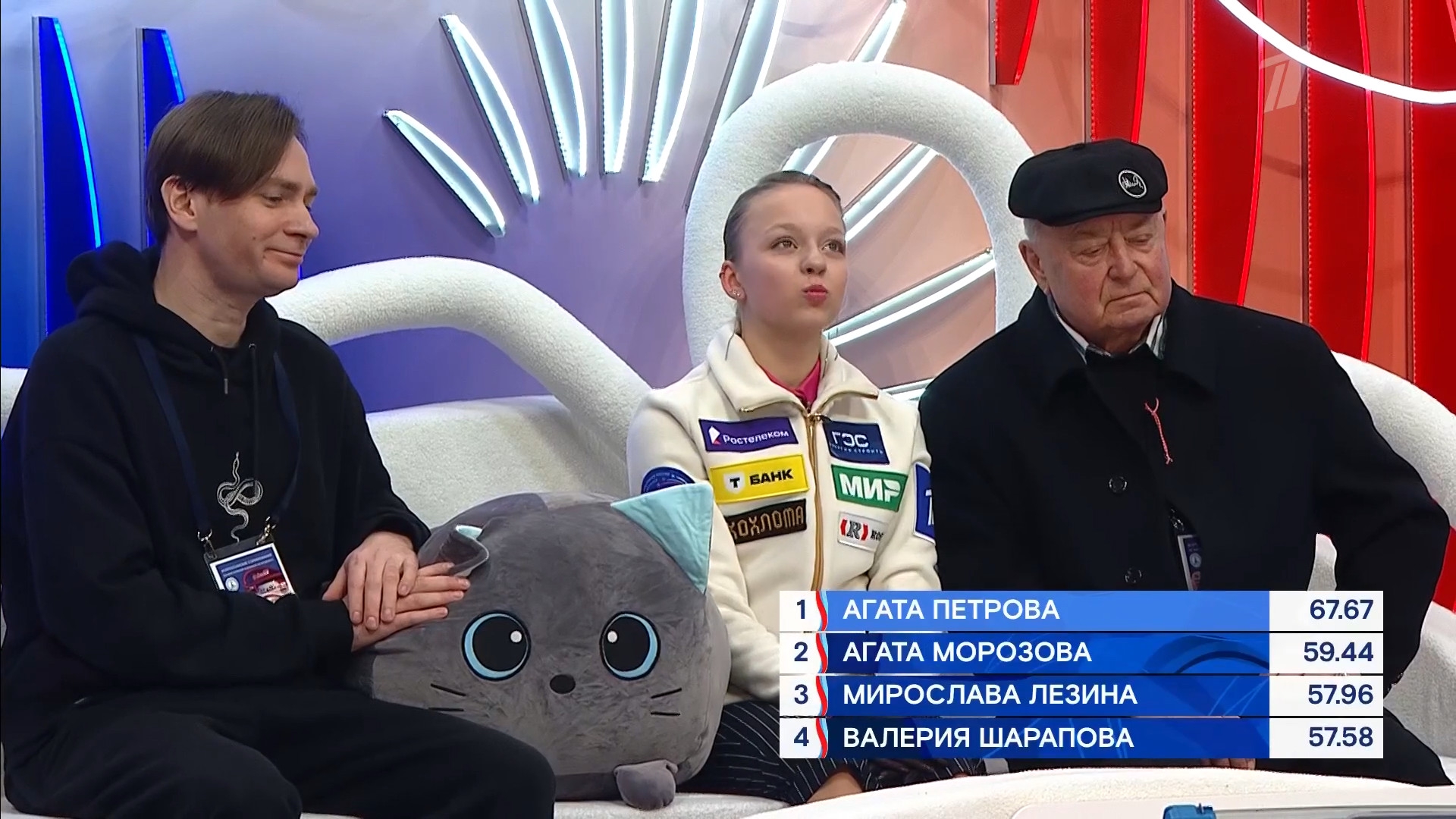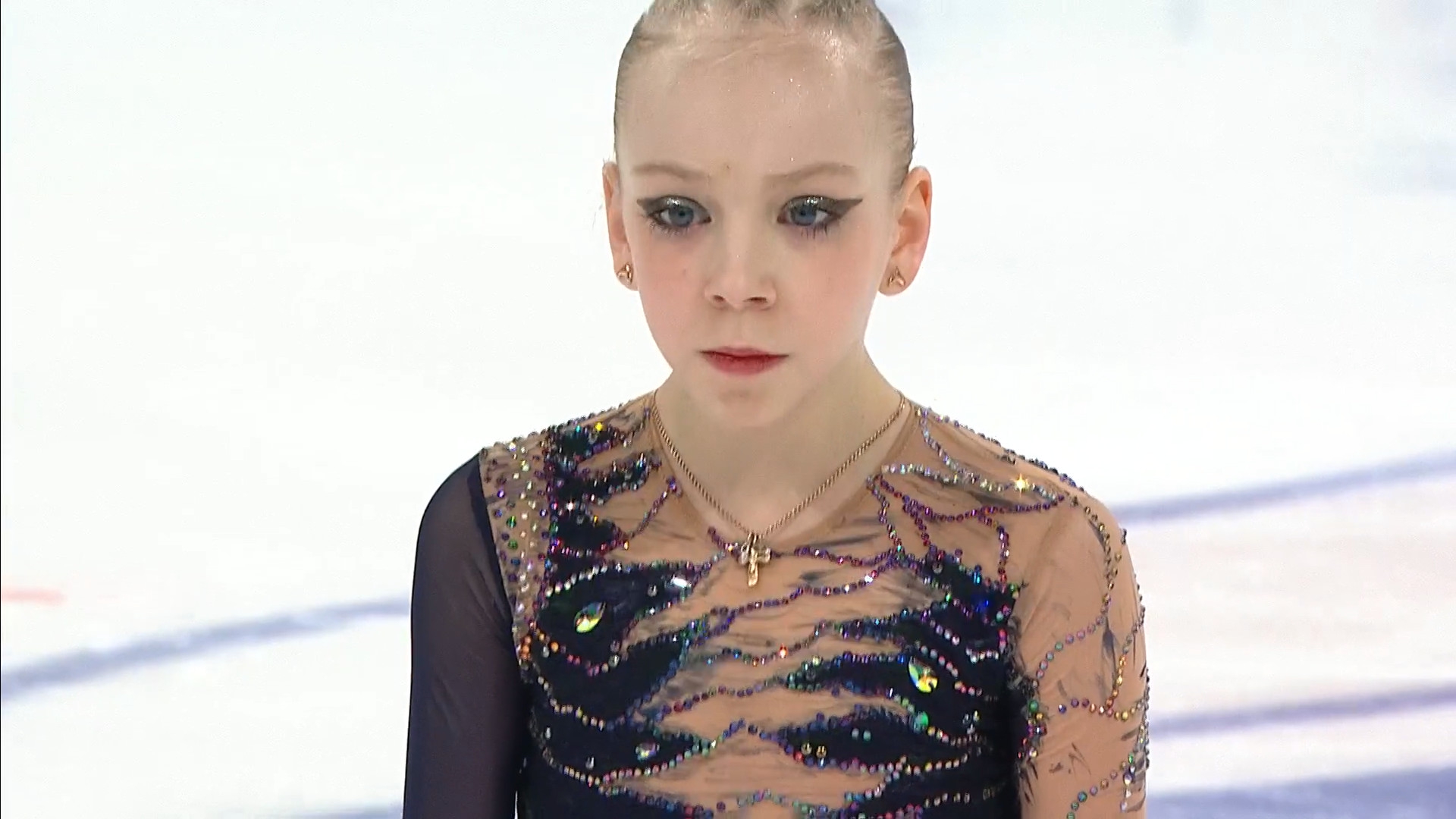 Милана Александровна ПУШКОВА швырнула чехлы под ноги тренеру, ей пришлось нагибаться, поднимать. 2a< 3s<< в подпрыжку, одноножный stsq уровня юный фигурист с подпрыжкой в шпагат 2z2r не успела? оставила приятное впечатление.