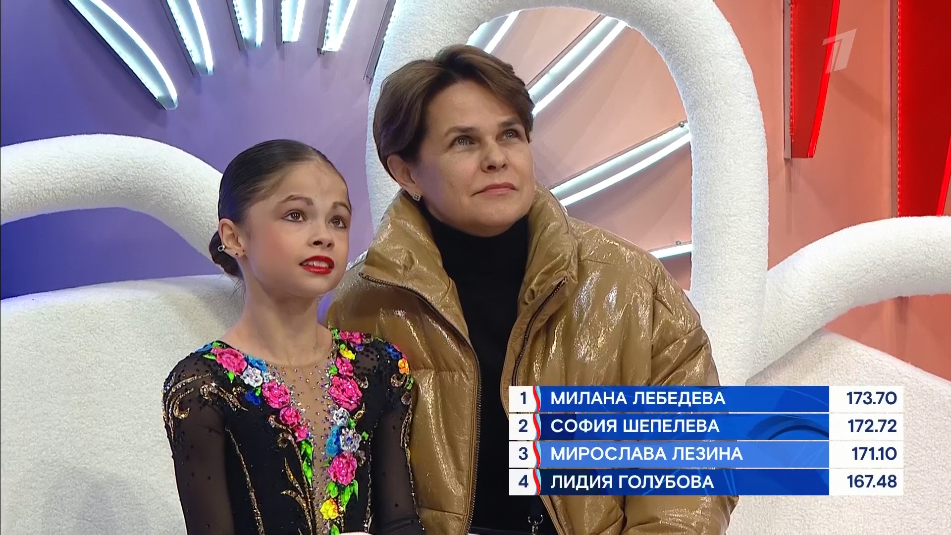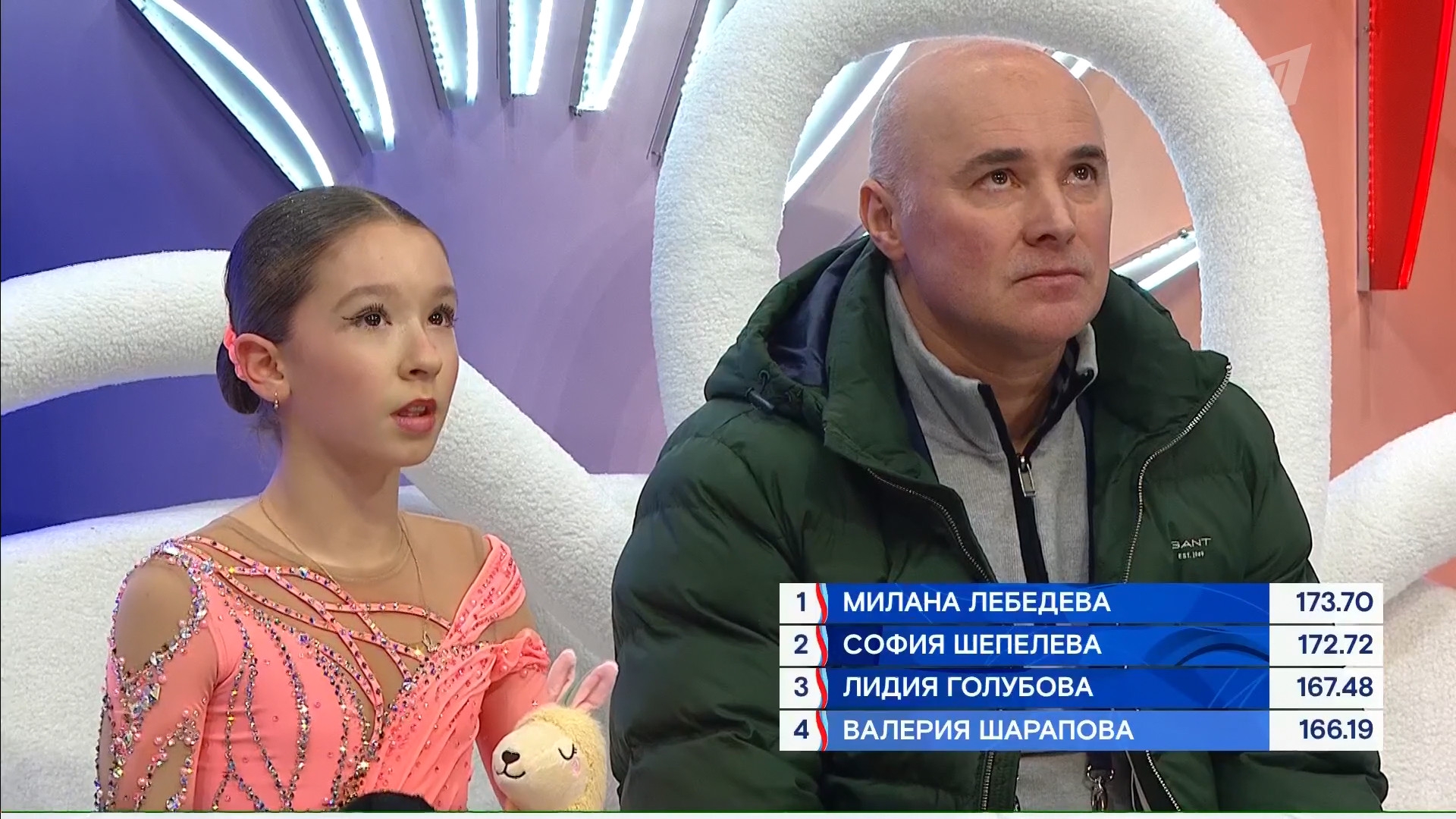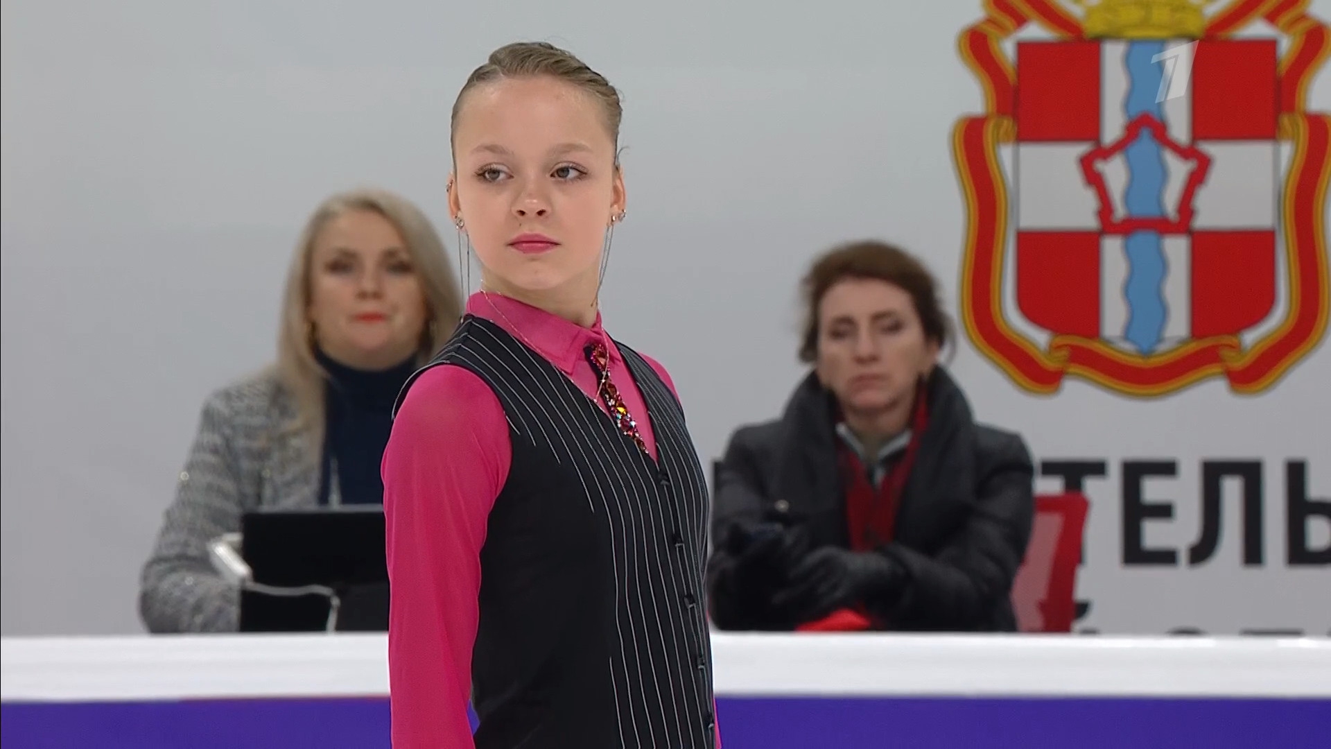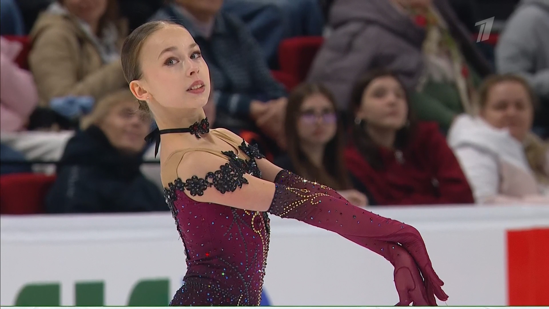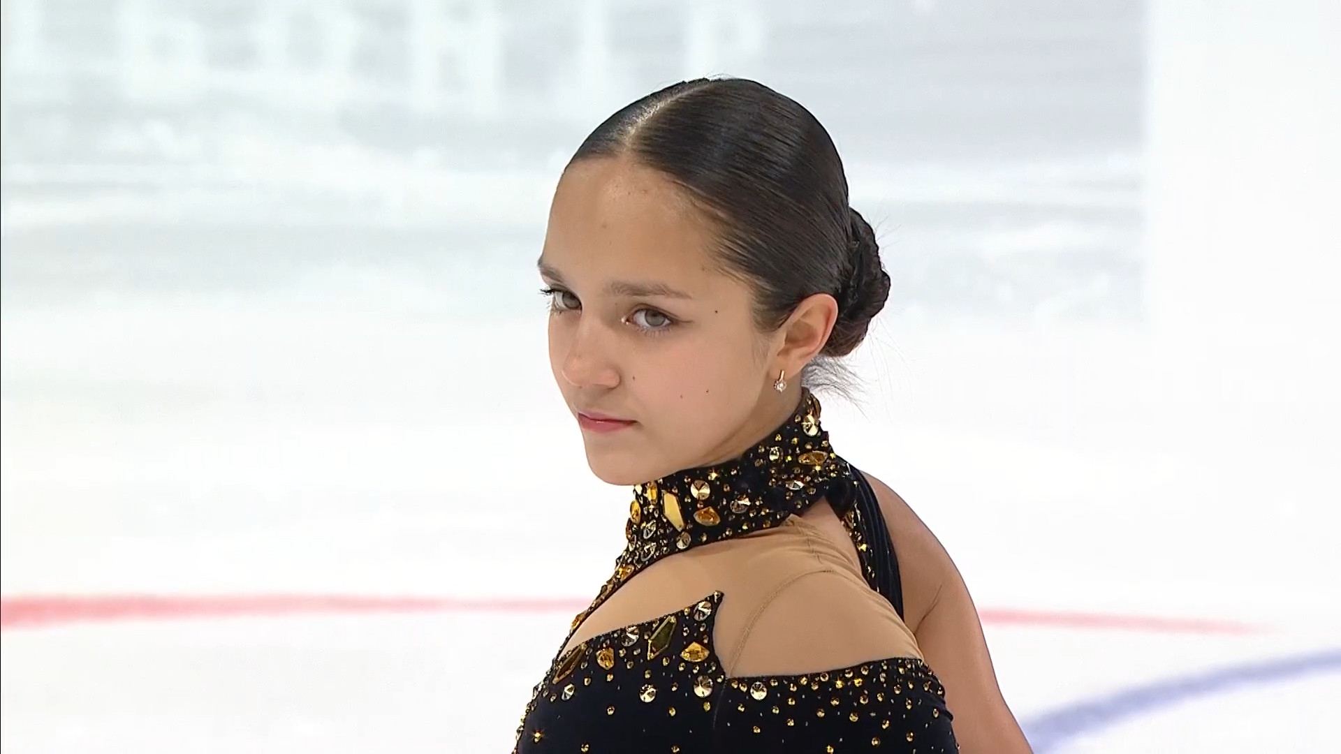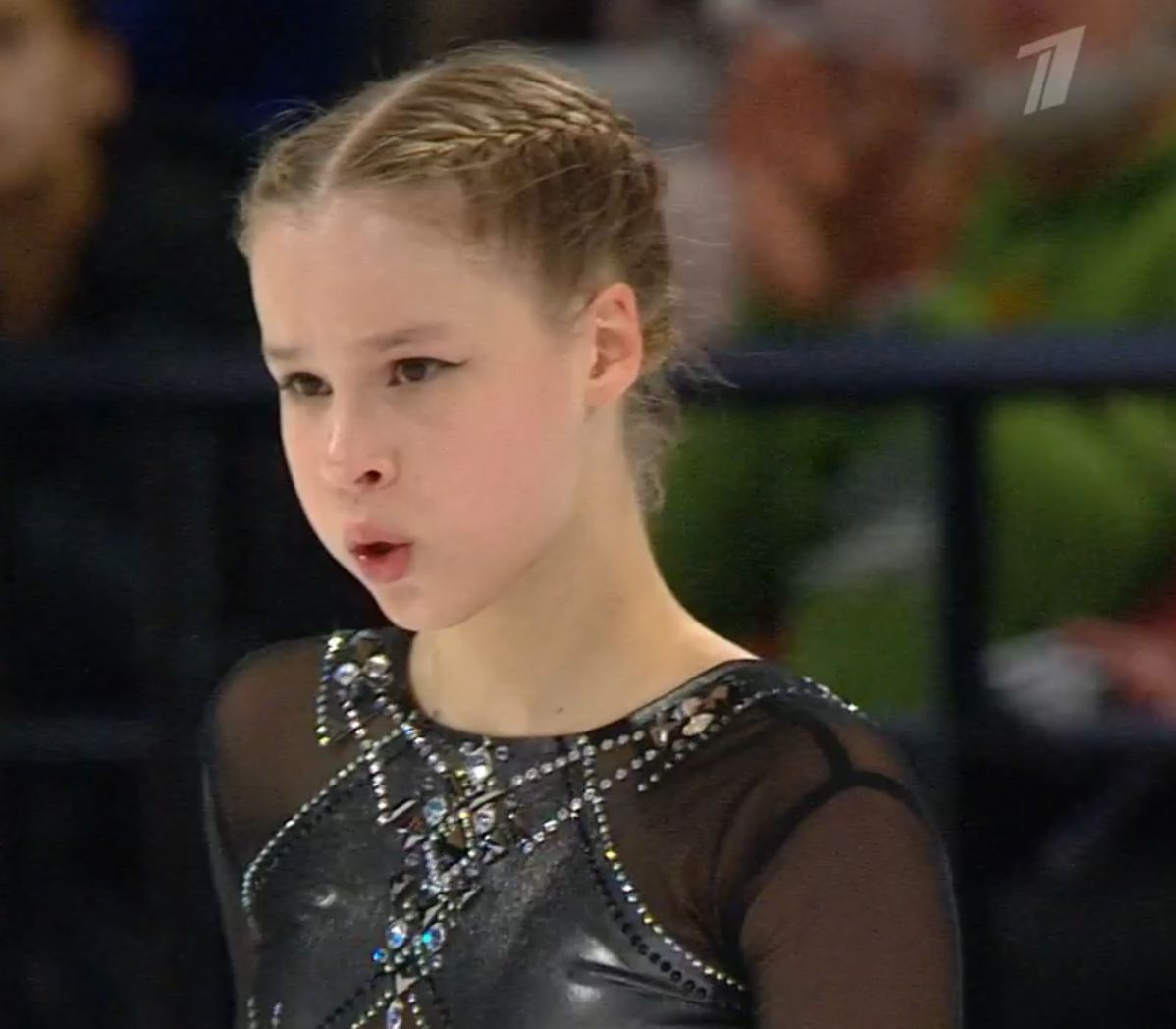 Милана Александровна ПУШКОВА швырнула чехлы под ноги тренеру, ей пришлось нагибаться, поднимать. 2a< 3s<< в подпрыжку, одноножный stsq уровня юный фигурист с подпрыжкой в шпагат 2z2r не успела? оставила приятное впечатление.