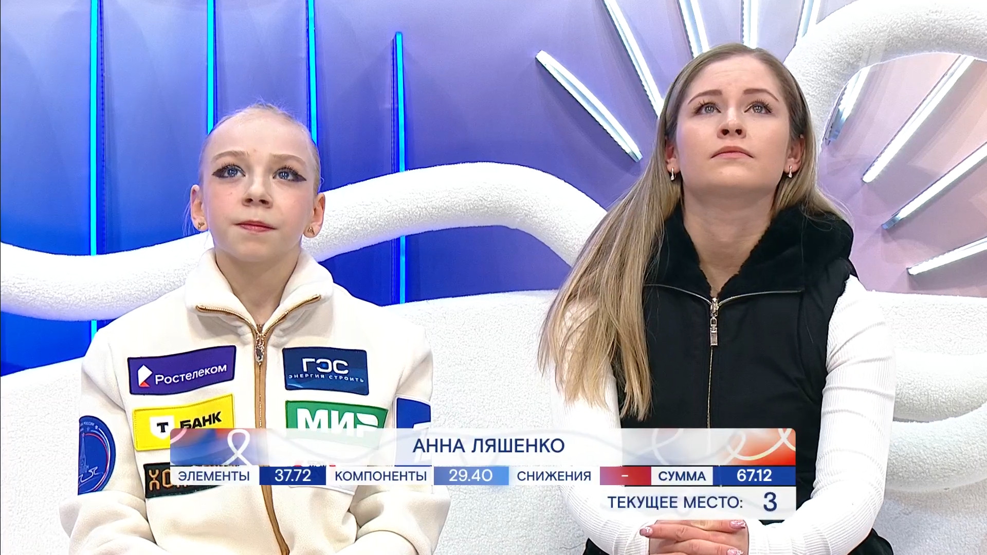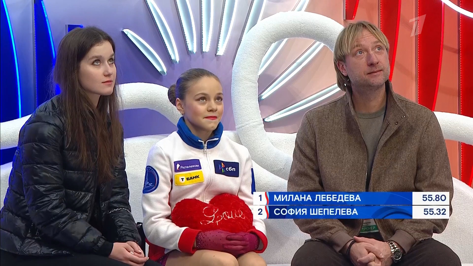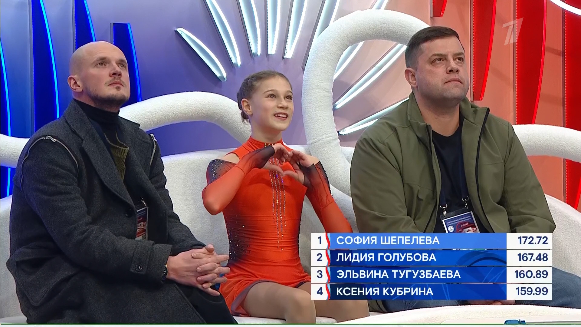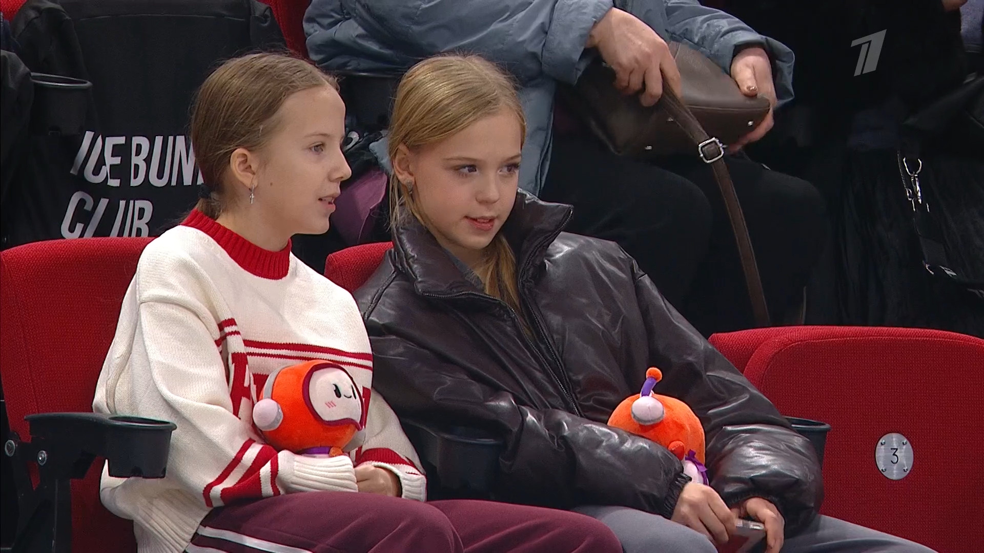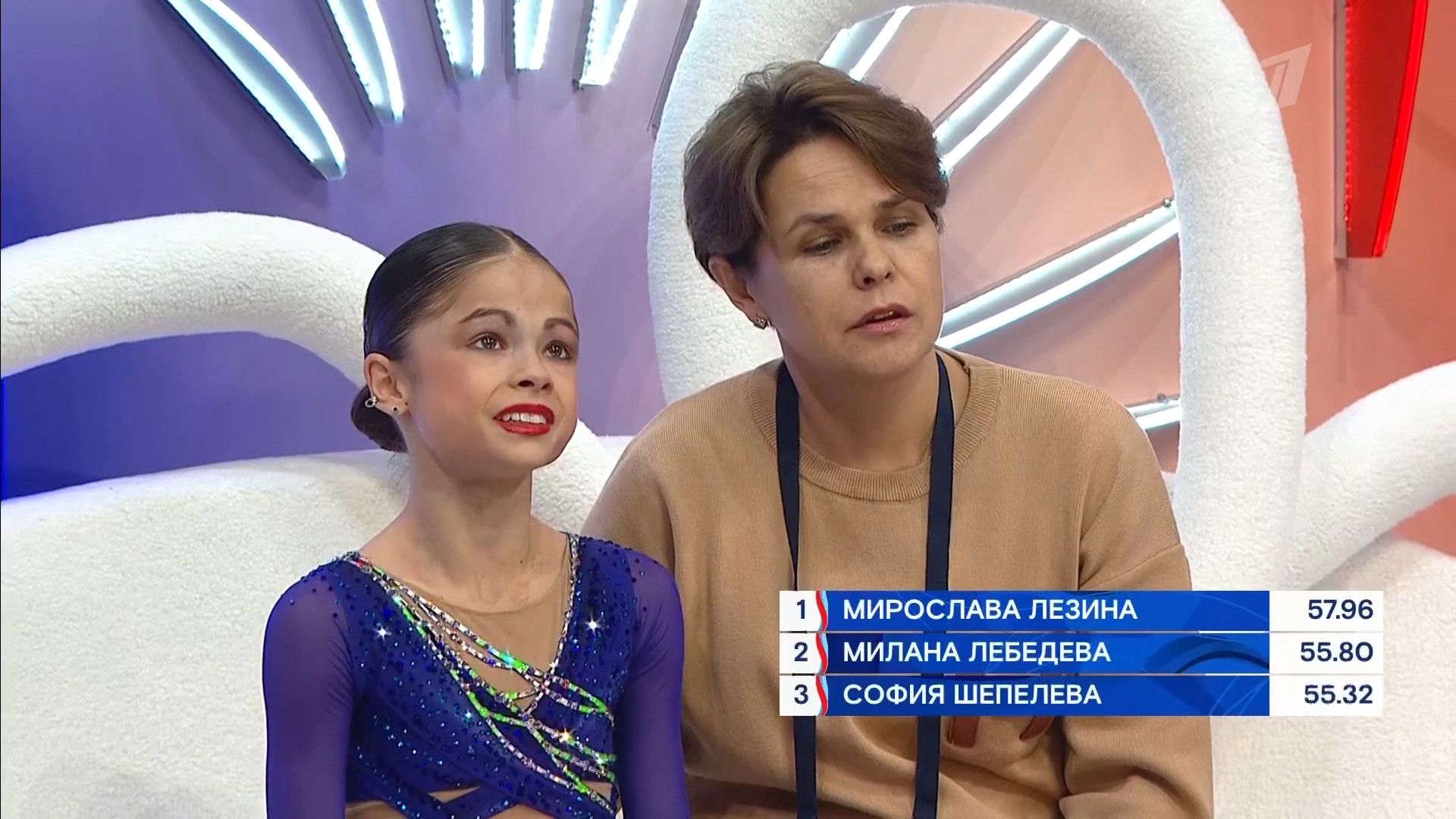 Милана Александровна ПУШКОВА швырнула чехлы под ноги тренеру, ей пришлось нагибаться, поднимать. 2a< 3s<< в подпрыжку, одноножный stsq уровня юный фигурист с подпрыжкой в шпагат 2z2r не успела? оставила приятное впечатление.