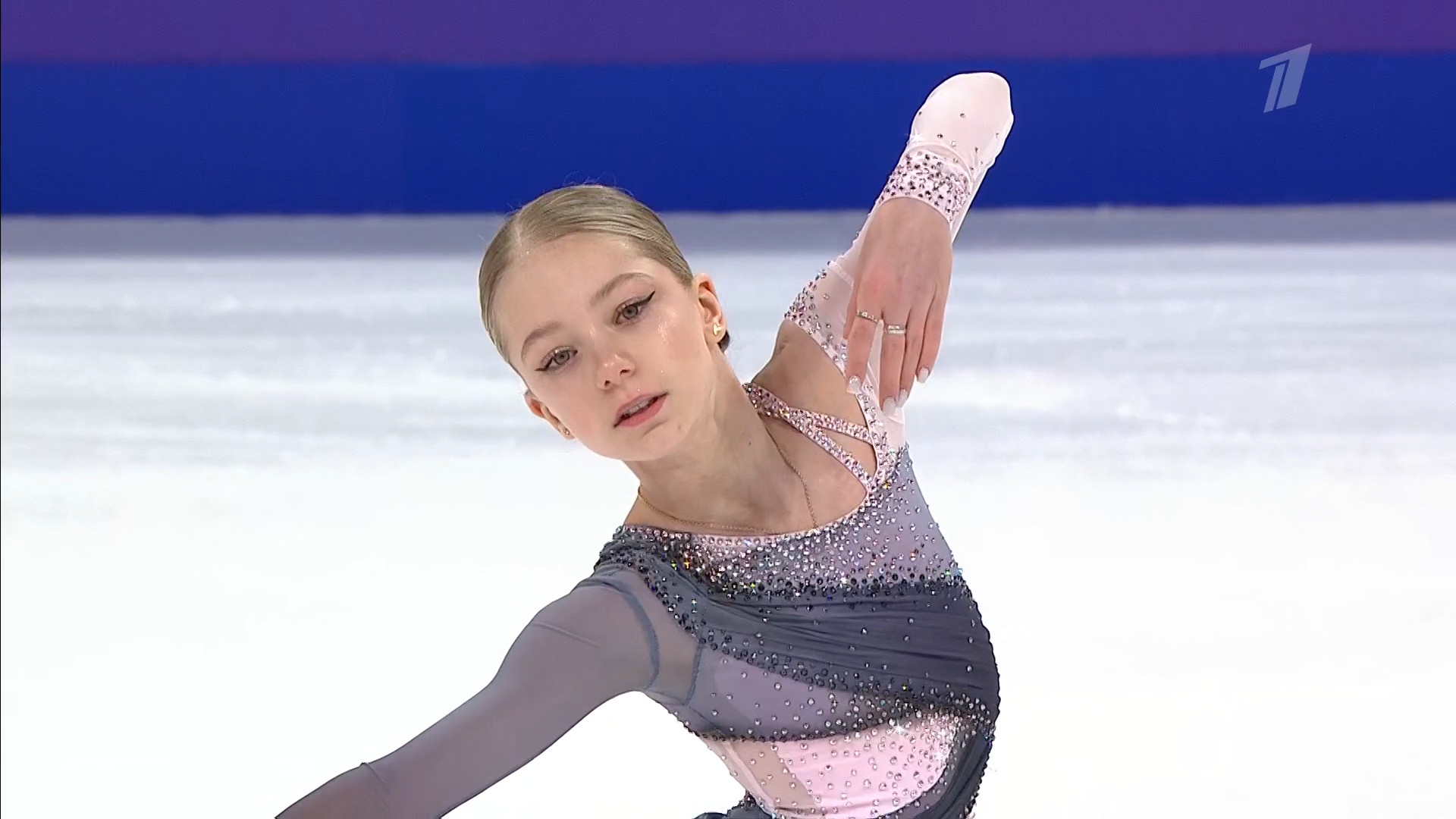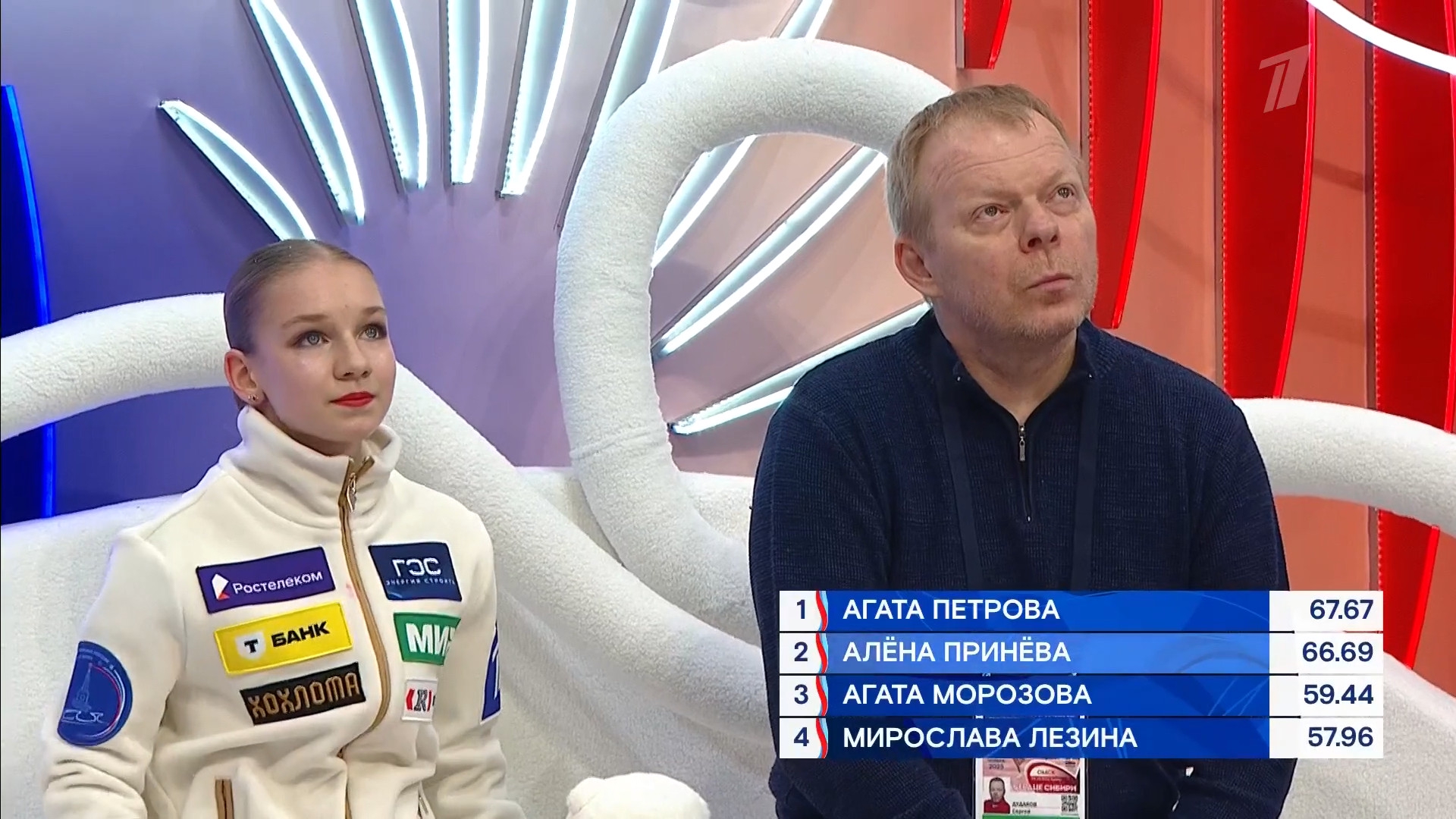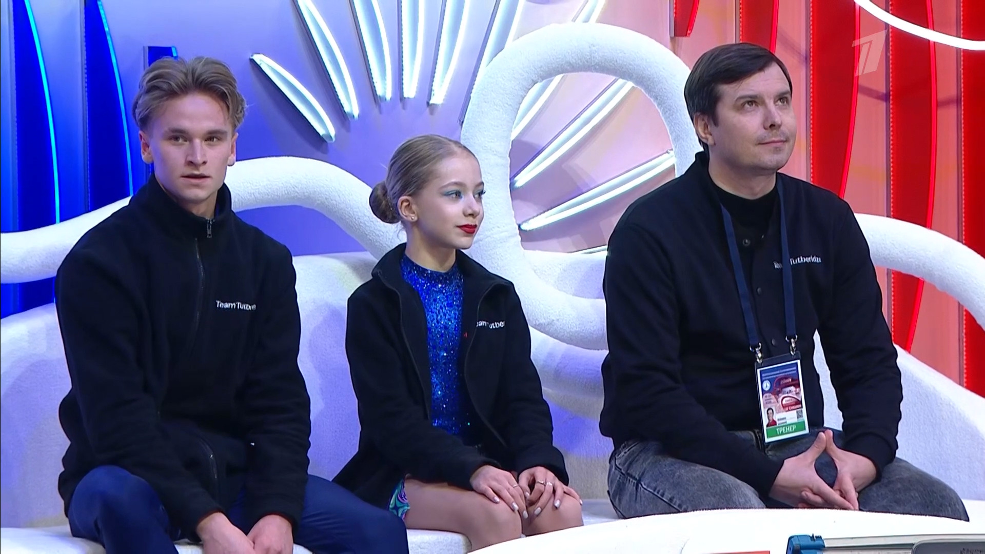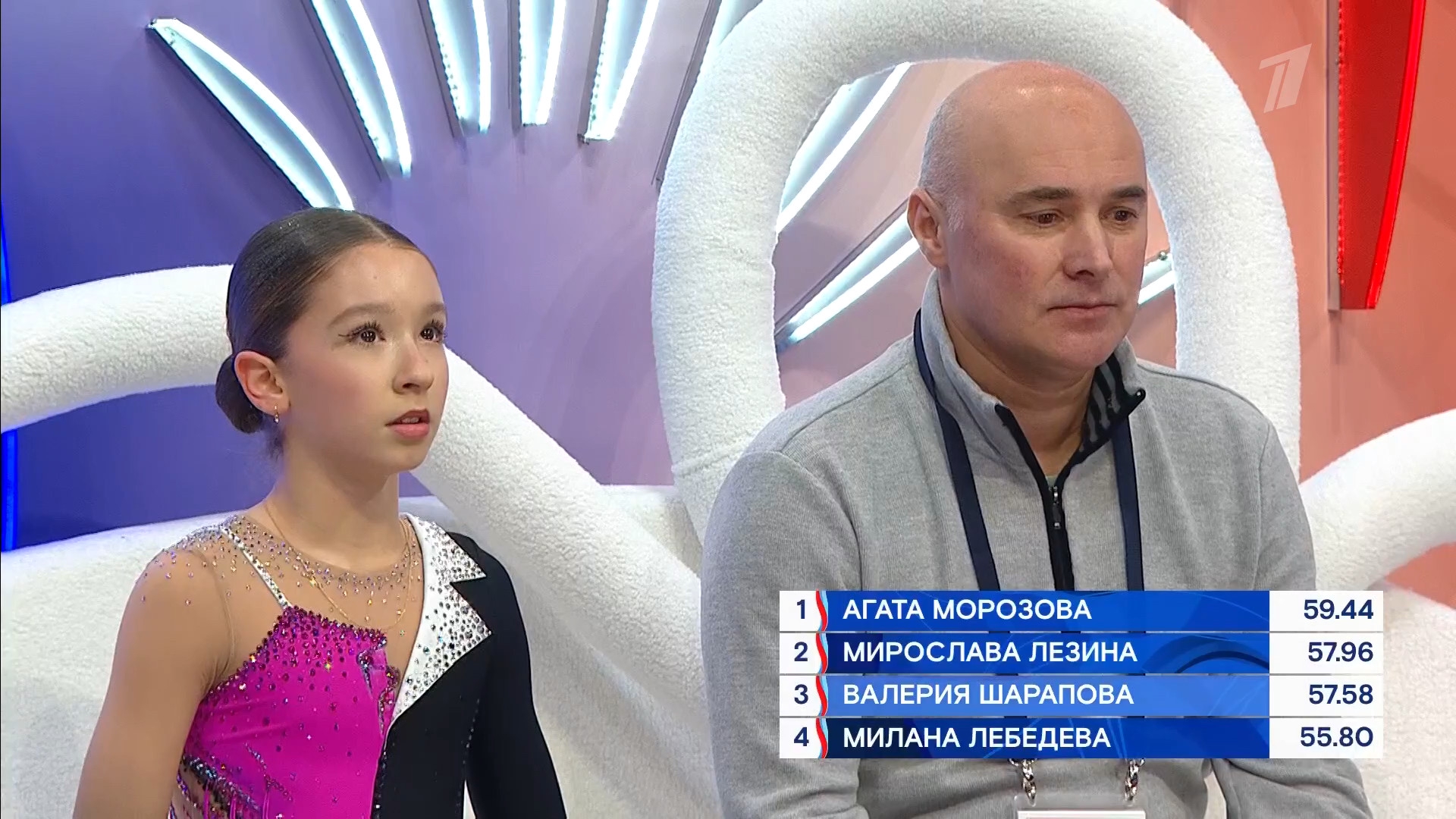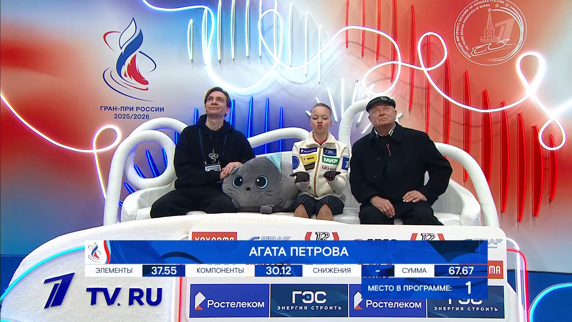 Милана Александровна ПУШКОВА швырнула чехлы под ноги тренеру, ей пришлось нагибаться, поднимать. 2a< 3s<< в подпрыжку, одноножный stsq уровня юный фигурист с подпрыжкой в шпагат 2z2r не успела? оставила приятное впечатление.