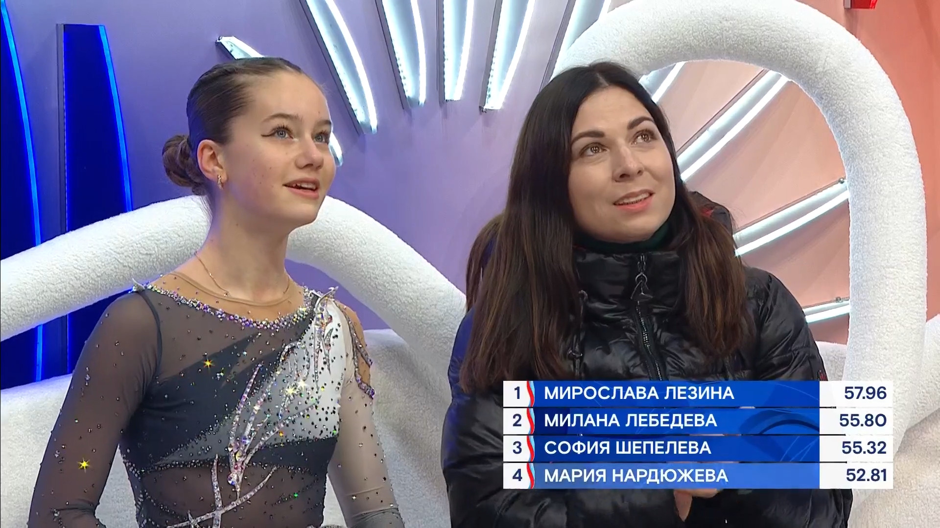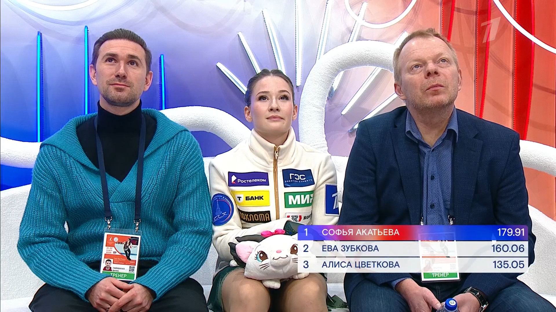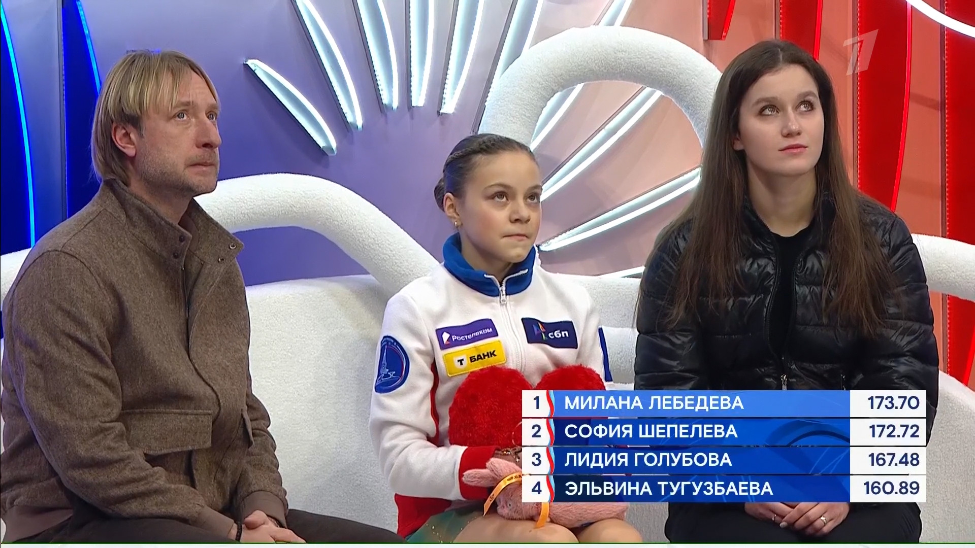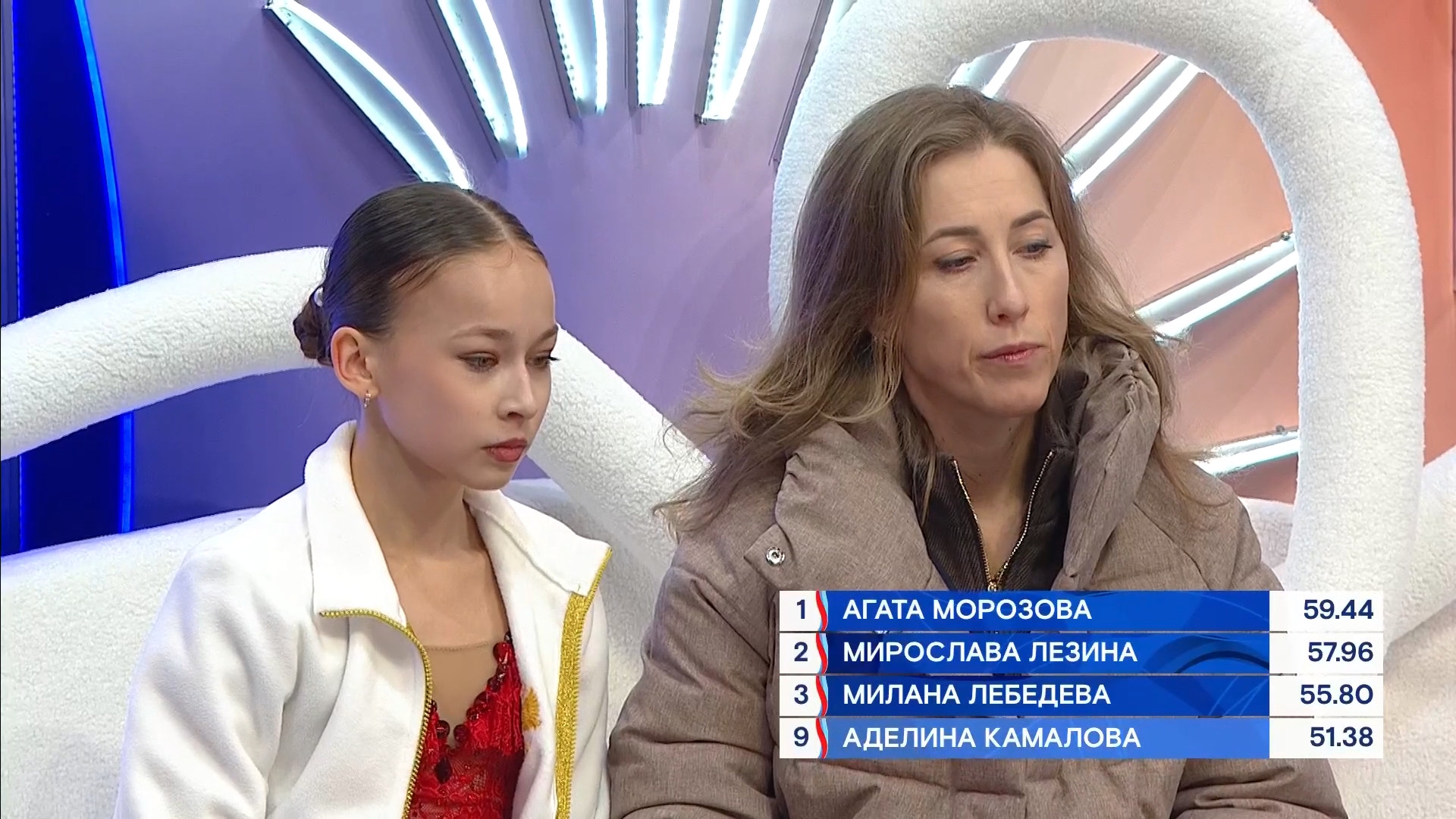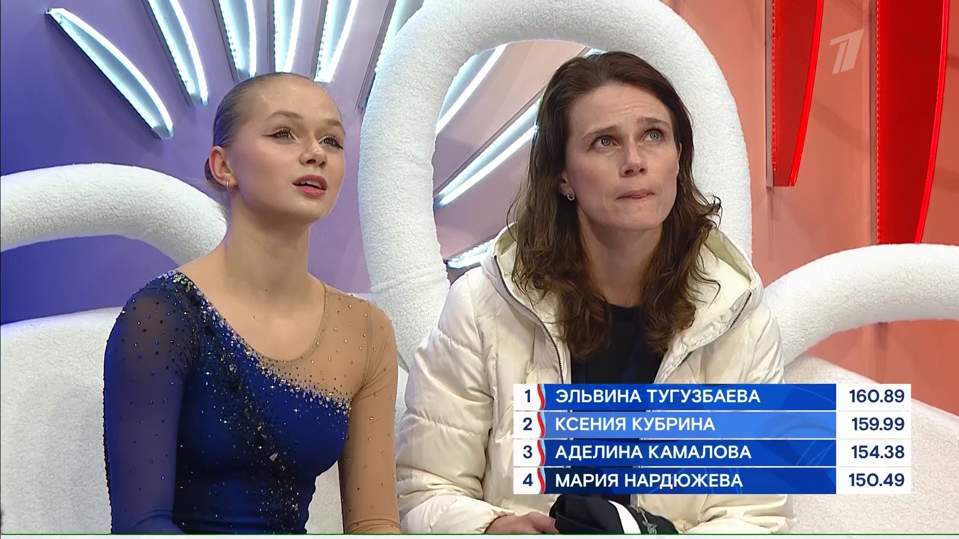 Милана Александровна ПУШКОВА швырнула чехлы под ноги тренеру, ей пришлось нагибаться, поднимать. 2a< 3s<< в подпрыжку, одноножный stsq уровня юный фигурист с подпрыжкой в шпагат 2z2r не успела? оставила приятное впечатление.