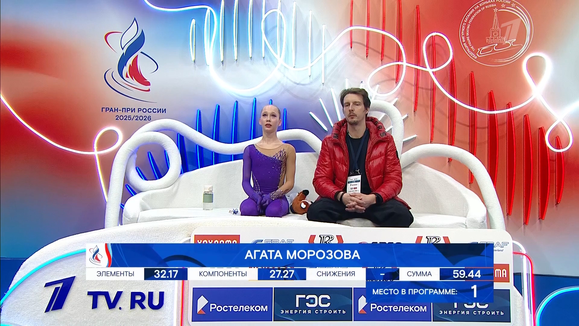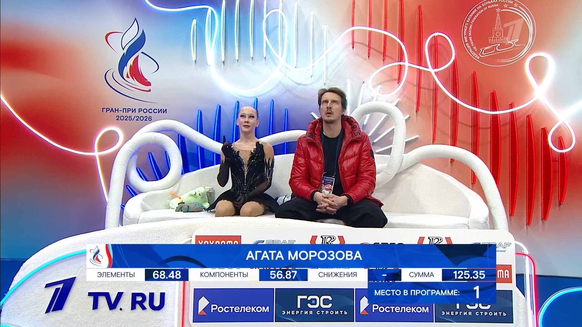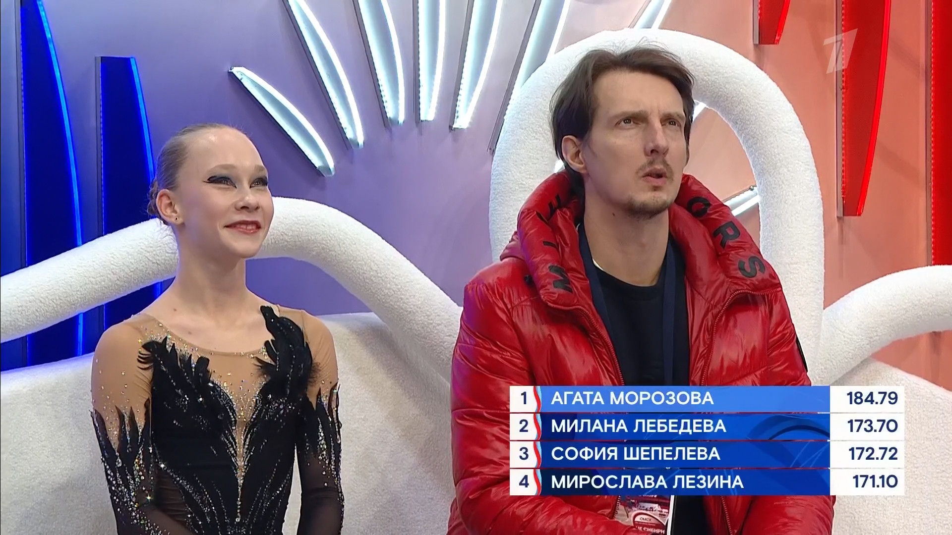 Агата Александровна МОРОЗОВА без Ефимовой, с Поповым Санкт-Петербург, СШОР "Звездный лед" >я тебя заколдовала 3z!3t присела невероятно сильно и оттуда делает абсолютно докрученный тулуп 2a с кораблика 3r<??? закрутило волчком, касание руками, даже такой низкий присяд не помог stsq2 хорошая работа корпусом, но пошатывает >я на риттбергере спотыкалась ехала