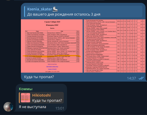 >>3261242 Не могли бы вы сюда фото с выложить где Солнцева с Филимоновной, с Пановой и другими тренерами, где бабка ей причёску делает, да и остальные тоже. Допускаю, что всё это здесь уже было, но можно и продублировать. https://t.me/s/teamSolnsevaoff