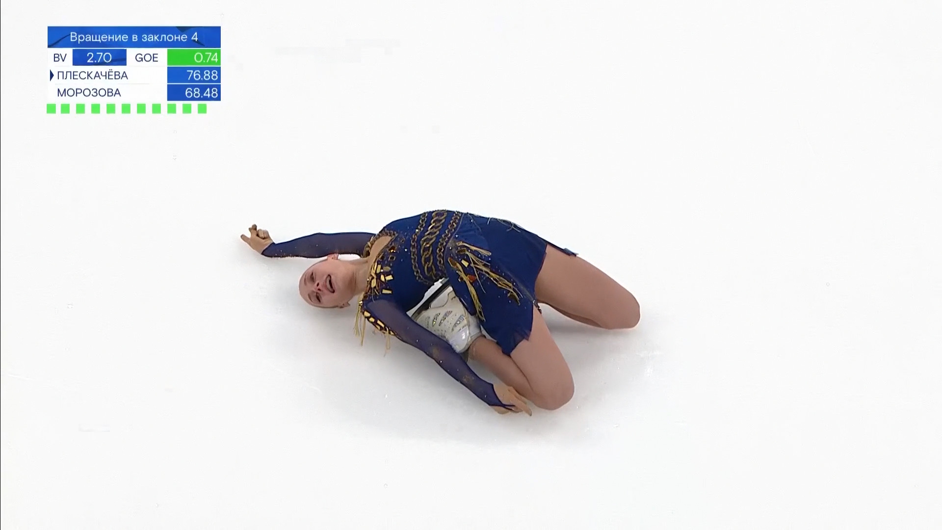 Лидия Дмитриевна ПЛЕСКАЧЁВА, Панова Москва, МАФКК - школа "Легенда", отд."Снежные барсы" 2a с хз в хв прыжок в шпагат 3r в хв с одной рукой наверх 3z!3t с телеграфа (чуть-чуть не хватила более длинного выезда, чуть-чуть её закрутило в такую запятую, чуть протяжности не хватило) легендарное валяние на льду stsq2 ccosp3 чуть не успела