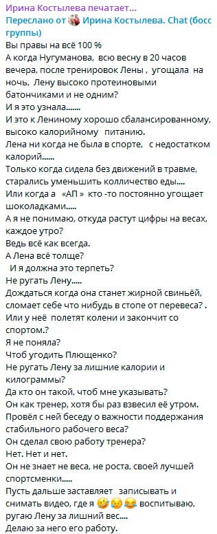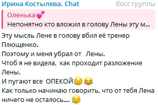 >«Друзья, как и обещал, подарил Лене хороший телефон за волю к победе и за 1-е и 2-е место на этапах серии Гран-При, помимо традиционных призовых от Академии, но об этом чуть позже! >Теперь этот телефон — имущество Лены, и никто его не может у неё забрать! Она его заслужила своим трудом! Лена теперь будет всегда на связи со мной и нашими тренерами по всем вопросам! >Лена, только вперед! Мы всегда рядом и всегда тебя поддержим. 💪🏻» – Евгений Плющенко Теперь будет дикпики присылать и Ирина Алексеевна ничего не сможет сделать.