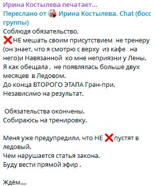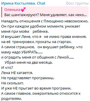 Яна Рудковская - под постом Евгения Плющенко об Ирине Костылевой. Полностью поддерживаю этот деликатно написанный пост. От ее потока негатива страдают все - и дети, и тренеры, и наблюдатели. Вечно «недовольной маме» у которой в каждой школе есть теории заговора - старосты, йогурты и блатные - важно помнить, что даже олимпийское терпение может лопнуть. Ну и я еще пока своего слова не сказала ! Пока. Не будите лихо,пока оно тихо! Из искры возгорится пламя! Очень не хочется выносить весь ссор из избы, только поэтому 2 года терпим из -за сильной, доброй и талантливой девочки!