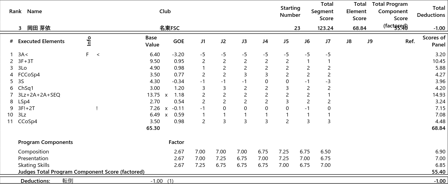 Камилла Андреевна НЕЛЮБОВА Краснодарский край, ООО "Е-спорт "Лед и пламя" 3a чуть вперёд на зубчик 2t 3f - так и q могут поставить 3s 3r чуть на зубце качнуло chsq1 3zq? fall 3f2a2a 3z2t без 3-3 в итоге stsq2