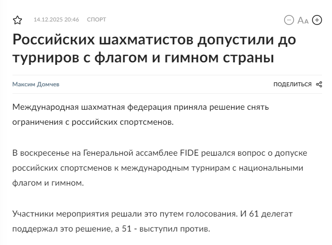 Российских шахматистов допустили до турниров с флагом и гимном страны