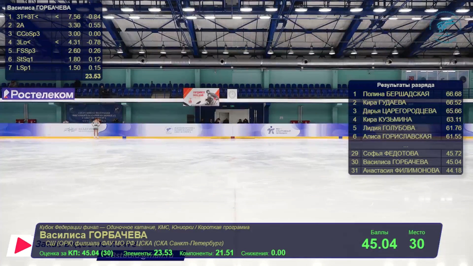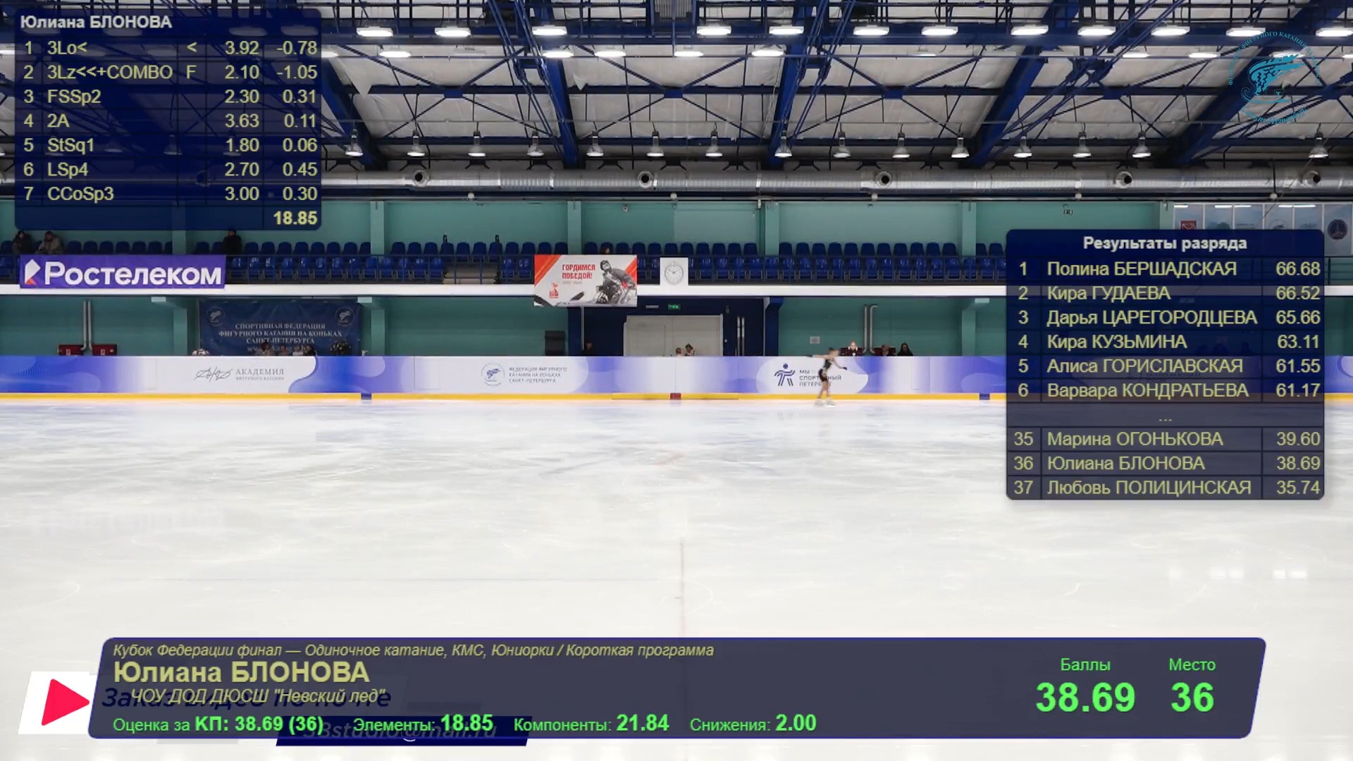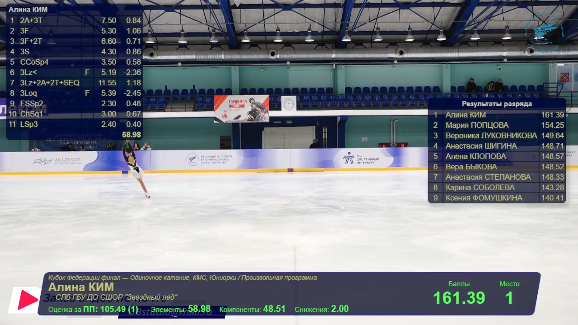 Вероника Владимировна ПОПОВА, 16 лет (2009-10-22) СПБ ГБУ ДО СШОР "Академия фигурного катания на коньках" 3z3t (R) 2a в твизлы 3r (R) - q нашли stsq3 (R) - пересмотрели на 2 почти всё на пересмотр поставили (зачем-то)