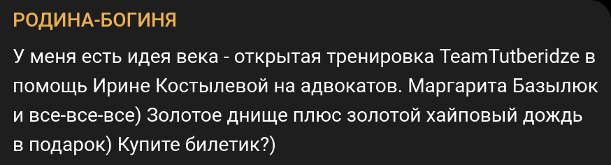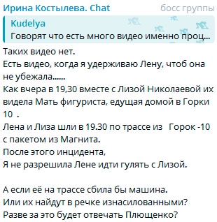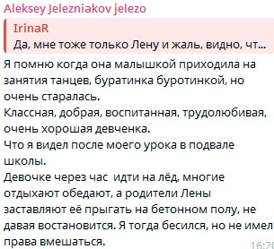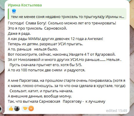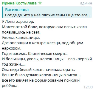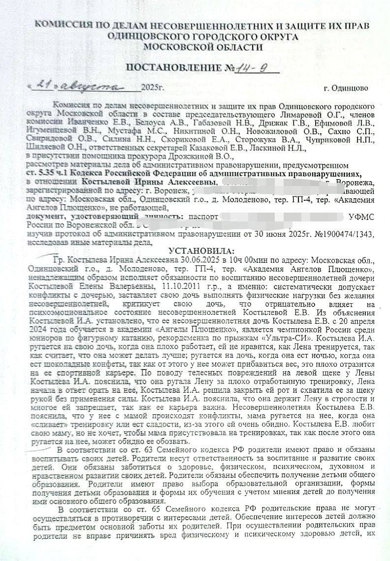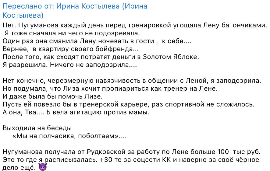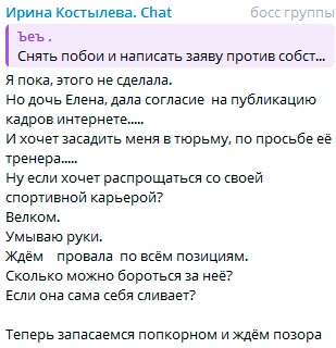 >Юристы разбираются в ситуации в связи с жалобой тренера Евгения Плющенко на мать фигуристки Елены Костылевой, для разрешения конфликта подключен медиатор. Об этом сообщила ТАСС уполномоченный при президенте РФ по правам ребенка Мария Львова-Белова. >"Работаем по поступившему обращению. Юристы выехали, чтобы детально разобраться в ситуации совместно с профильными ведомствами. Подключился медиатор, который работает в нашем аппарате. Конечно, будем держать историю на контроле", - сказала Львова-Белова. >Ранее Плющенко, тренирующий фигуристку Елену Костылеву, сообщил в Telegram-канале, что направил жалобу на имя уполномоченного при президенте РФ по правам ребенка Марии Львовой-Беловой на мать спортсменки Ирину Костылеву из-за жестокого обращения с ребенком. Плющенко также утверждает, что Ирина Костылева регулярно допускала нецензурные оскорбления в адрес тренеров, других спортсменов и их родителей. По словам Плющенко, в его распоряжении есть видеоматериалы, подтверждающие случаи физического воздействия на фигуристку со стороны матери, при этом подчеркивается, что Ирина Костылева уже стоит на учете в органах опеки по этому вопросу. >Кроме того, Плющенко пожаловался на съемку Ириной Костылевой детей, занимающихся в "Ангелах Плющенко", а также обвинил мать фигуристки в клевете в отношении тренерского штаба академии. Вот и фсё. Помянем Ирину Алексеевну. Ну и Леночку заодно