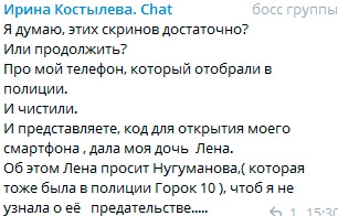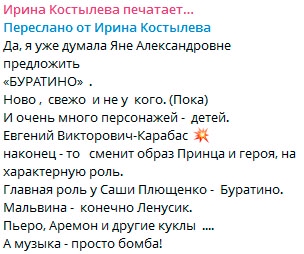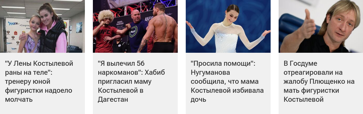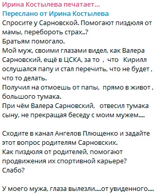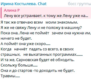 >Мама воронежской фигуристки Костылевой: «Мы чудом выкрали дочь из «Академии Плющенко» >— Слава богу, в понедельник вырвались из академии Плющенко, там пошли всякие нелицеприятные вещи в нашу сторону: угрозы и шантаж. В тот же день супруг Валерий приехал с Леной в Воронеж, я— чуть позже. >— До конца этого года мы не имеем права уйти из академии Плющенко , как член сборной России Лена просто так не может это сделать. Её задача сейчас — как можно лучше подготовиться к первенству России, которое пройдёт через два месяца. Но 14 декабря в Минске будет ледовое шоу, Яна Рудковская (жена Евгения Плющенко— «Ё!») просила, чтобы Лена обязательно участвовала в нём. У неё там главная роль, мы с мужем дали согласие на это, но только в моём присутствии. Евгений и Яна чуть ли посадить меня хотят за моральный ущерб самой Академии, потому что я рассказывала о том, как поступают там с моей девочкой, что у неё масса травм из-за этого. >По словам Ирины, вчера её старшей дочери прислали «компрометирующее видео на отца» Лены Валерия. На кадрах он якобы в нетрезвом виде сидит за столом на праздновании Дня Рождения с коллегами по работе. Муж Ирины устроен косильщиком газонов в Академии Плющенко. >Женщина твёрдо решила, что заберёт дочь из Академии насовсем. >«Боюсь, правда, что Лене там теперь нельзя появляться, мы чудом её выкрали, чтобы уехать в домой. После медосмотра сели уже с чемоданами в машину к Валерию, забрали нашего беспородного рыжего кота Фунтика, которого брали для Лены из приюта, и рванули в Воронеж», - подытожила Костылева старшая. https://moe-online.ru/news/sport/1243943 Как жи Ирина Алексеевна хайпует. Янка обзавидуется.