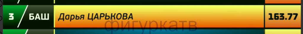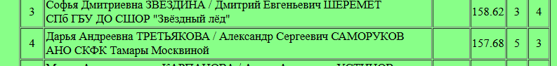 Мария Евгеньевна ЧЕСНОКОВА, 14 лет (2011-08-01) СПб ГБУ ДО СШОР "Звёздный лёд" Сарымсаковозаменительница 2a 3t3t< (R) первый тулуп высокий, пролётный 3r<< so (R) stsq2