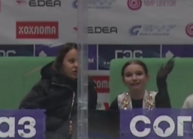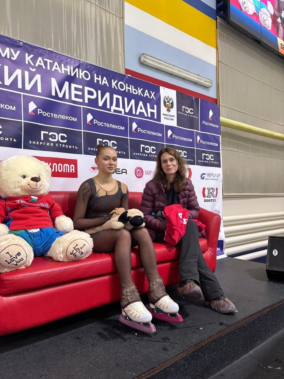 Тамара Александровна АНТОНОВА, Династия опять в эффектном платье 3z<?2t 3s2t 3z< ho? типа прыжок в шпагат 2a 3s< 2r 2z2r заход с гидроблейдом 47,93 тренерша (в золоте) рада больше ученицы