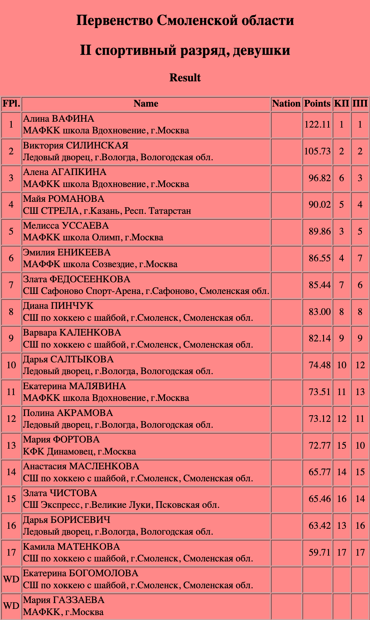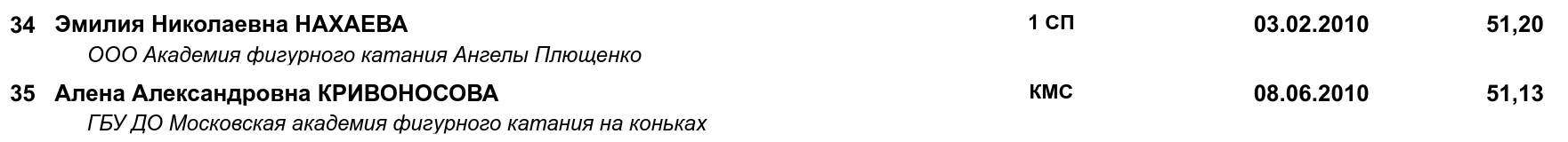 Азалия Ильнуровна ГАЗИЗУЛЛИНА, 13 лет (2012-08-02) ЧОУ ДОД ДЮСШ "Невский лед" 3rq/<? (R) ставят q 3zq2t (R) ставят < stsq2 2a< ho (R) с популярного года 2 назад захода "конёк над ухом"