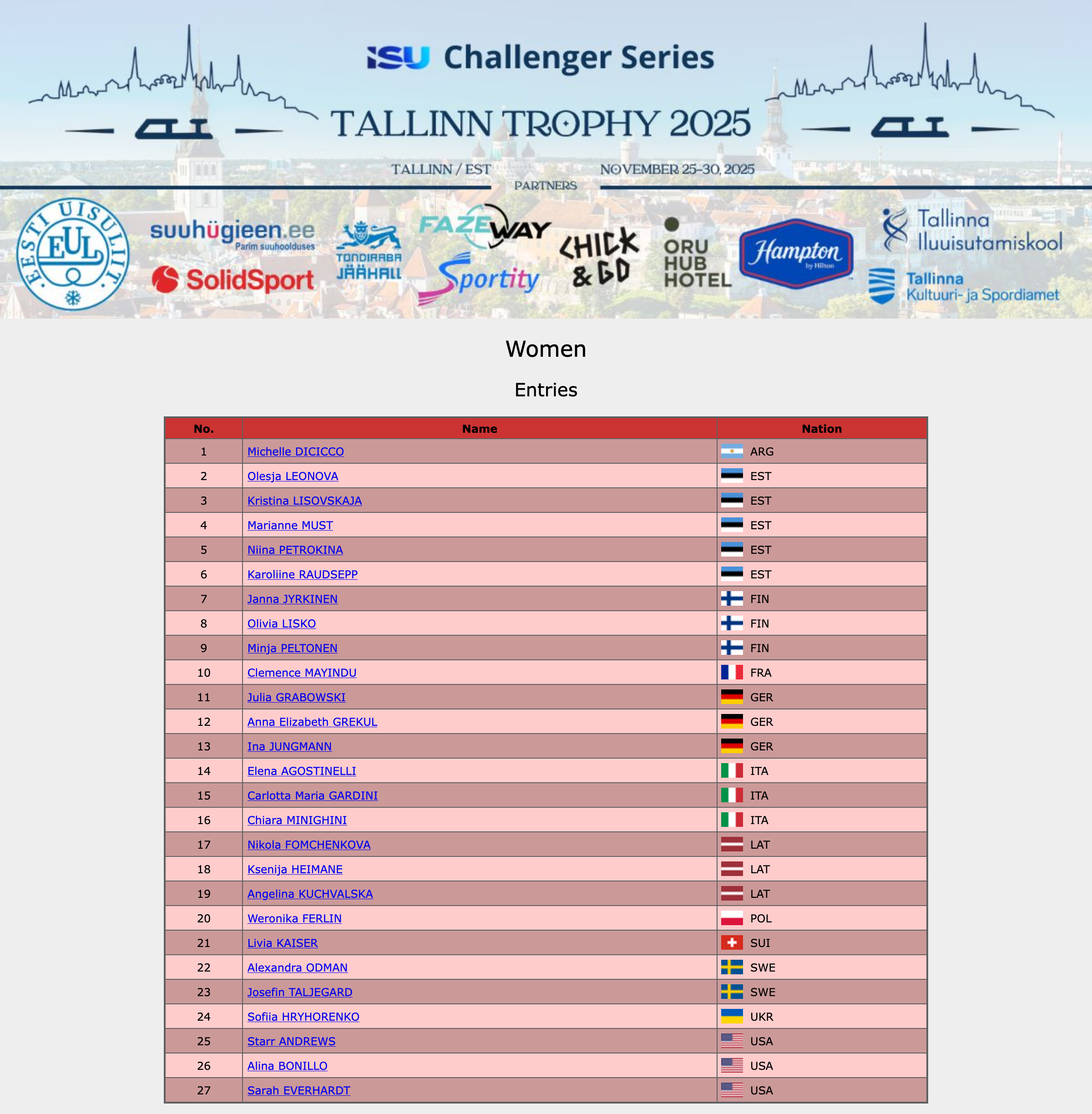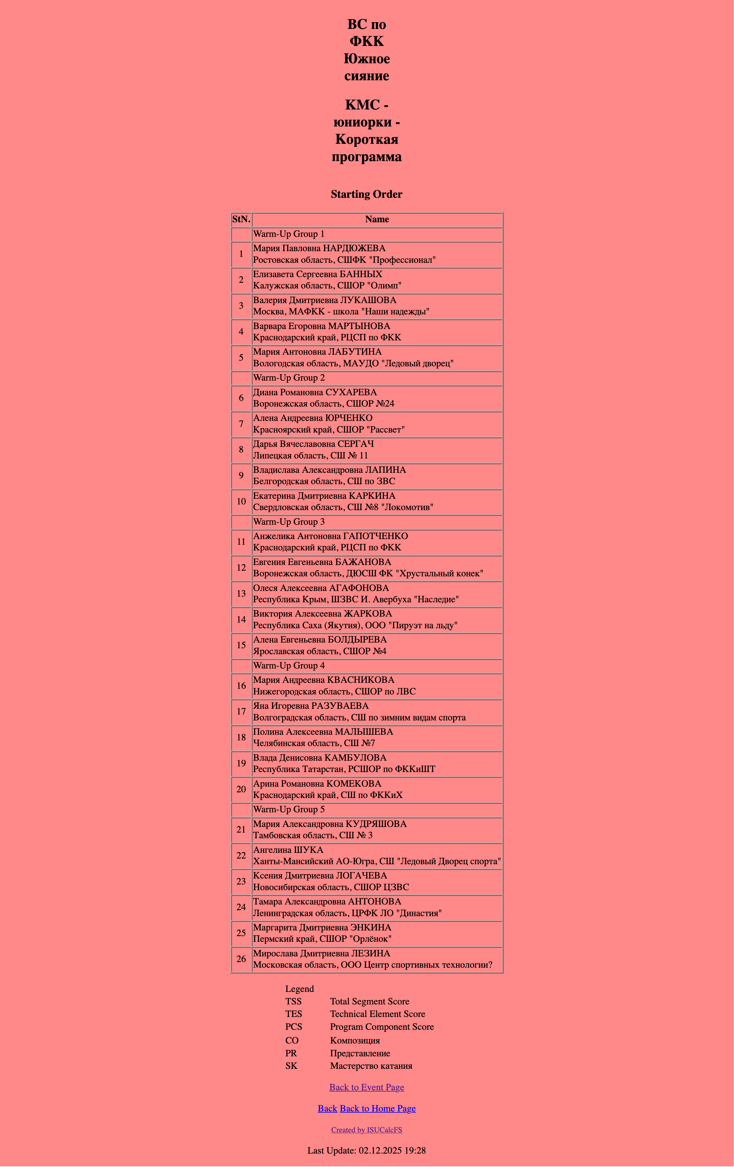 04-06 декабря, Всероссийские соревнования "Мордовские узоры", Саранск, Ледовый дворец Республики Мордовия Размер площадки: 30 х 60 м 1 сп.: Ксения СТАДНИЧУК, КМС: Ксения ВАГИНА, Ирина ГАРАЩУК, Кристина ДВУРЕЧЕНСКАЯ (кто-то уже готов стать её фанатом), Валерия ЛИТВИНЧЁВА, Валерия МЕЛЬНИКОВА, Маргарита ПЕРЕДЕЛЬСКАЯ, София САМУЙЛИК; МС: Kshetske, Арина МАРИНИЧЕВА (самая красивая), Ксения СИНИЦЫНА, Дарья ТРЕТЬЯКОВА, Екатерина ЦИПУХИНА Инфо: https://fsrussia.ru/sorevnovaniya/sorevnovaniya/vserossijskie-sorevnovaniya-mordovskie-uzory-2025 Табло: TBA Транса: https://vk.com/figurnoe_katanie_13