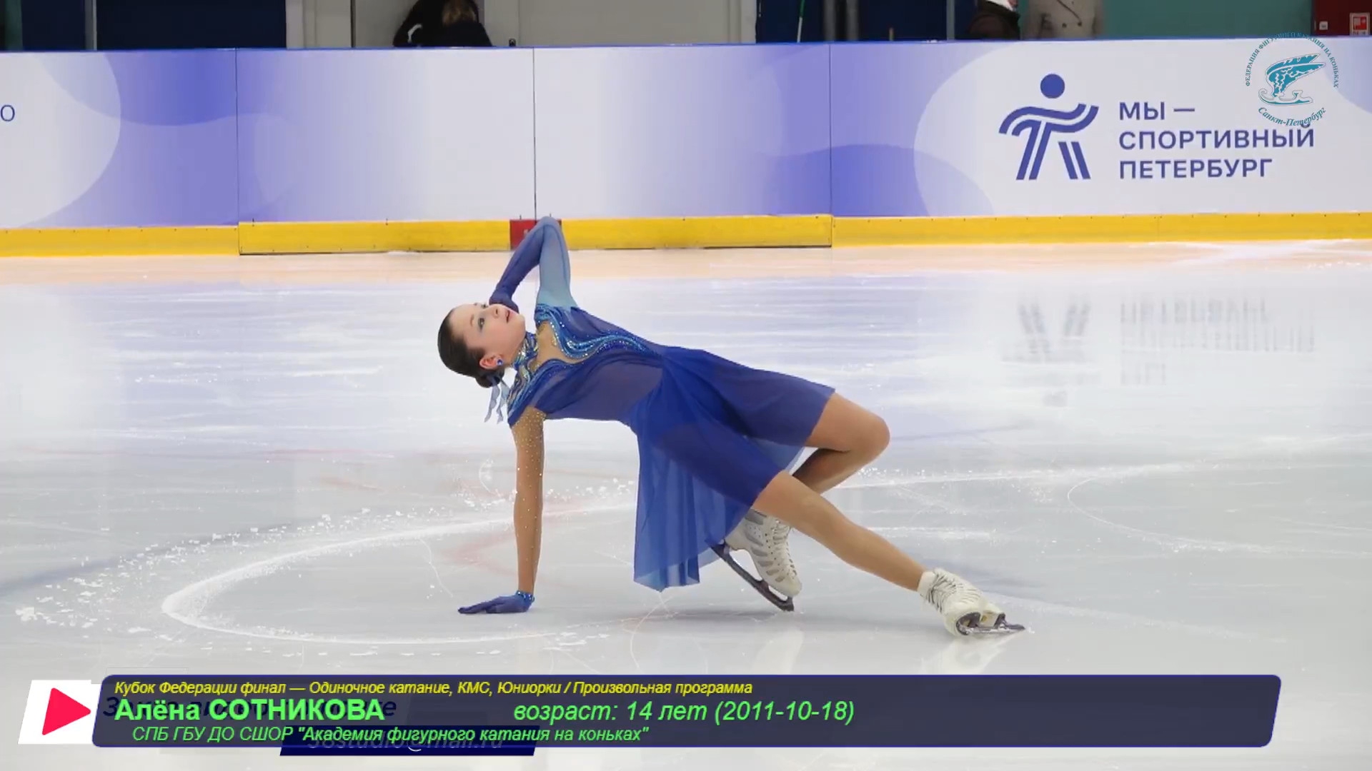Алёна Викторовна СОТНИКОВА, 14 лет (2011-10-18) СПБ ГБУ ДО СШОР "Академия фигурного катания на коньках" очень скучаю по старой КП хлопают, самая красивая тут, похожа на молодое Щербие 3z3t (R) 3r в хв Сотниковой 2a с дрыга stsq2 что-то коньки совсем не едут