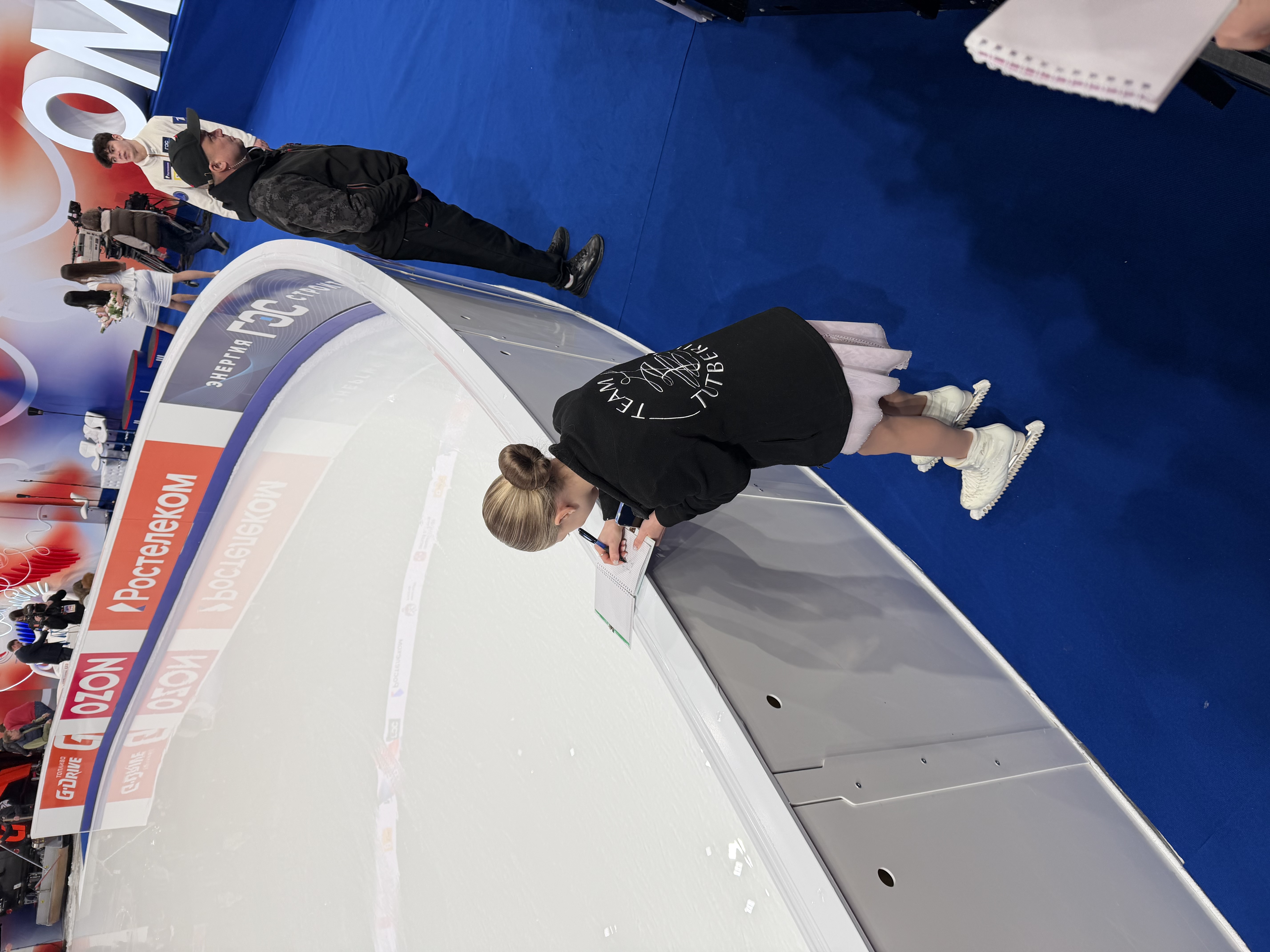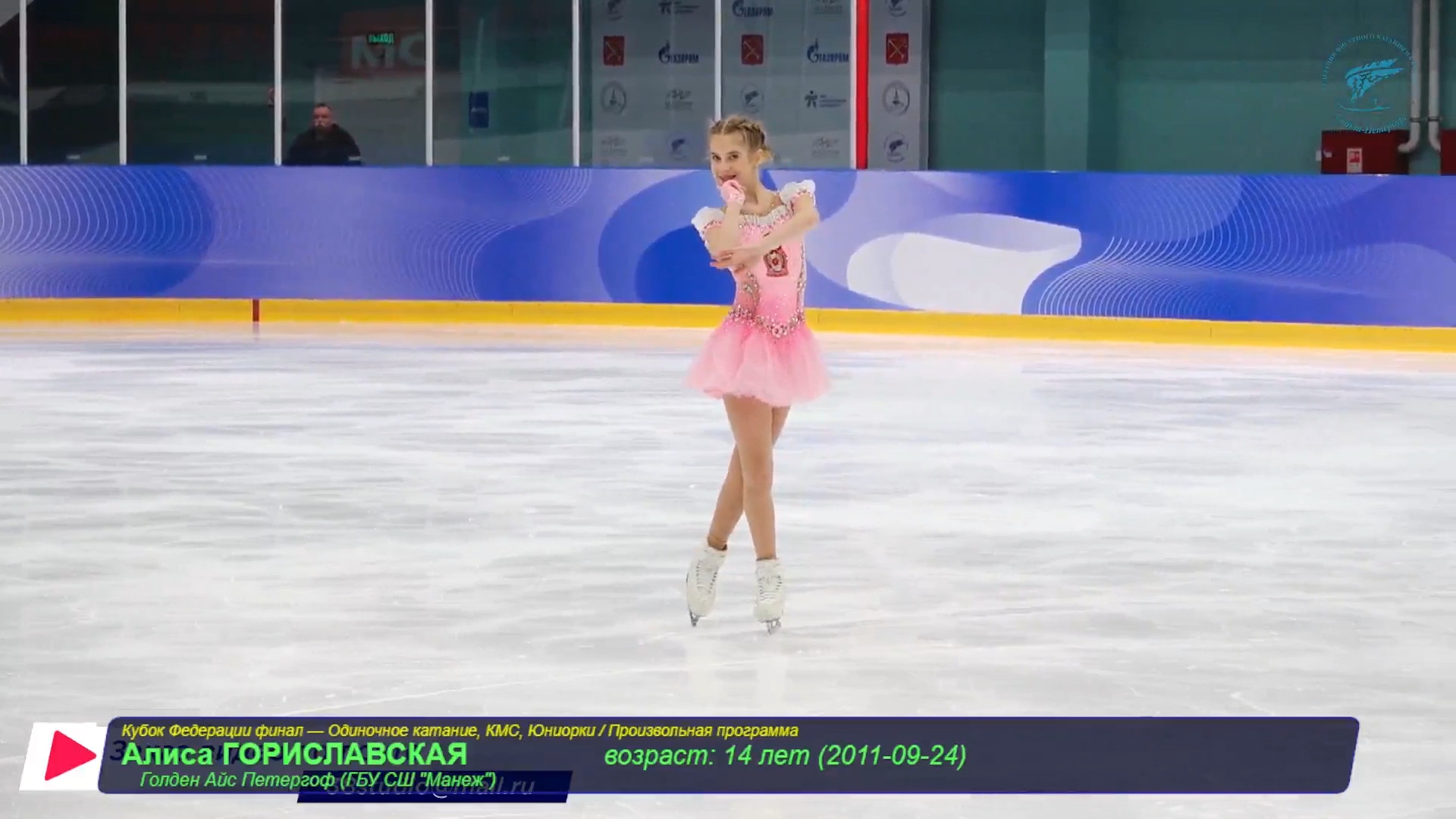 Кира Викторовна ГУДАЕВА, 14 лет (2011-09-05) СПб ГБУ ДО СШОР "Звёздный лёд" 2a в твизлы с руками наверх 3s 3z с пвш 3r с питерского захода в хв подъехала к борту и разогналась от него на 3z3t 3f2t2a 3f2t chsq1 гидроблейд-слайд на одной руке в стиле Сарафановой Царегородцевой на заметку