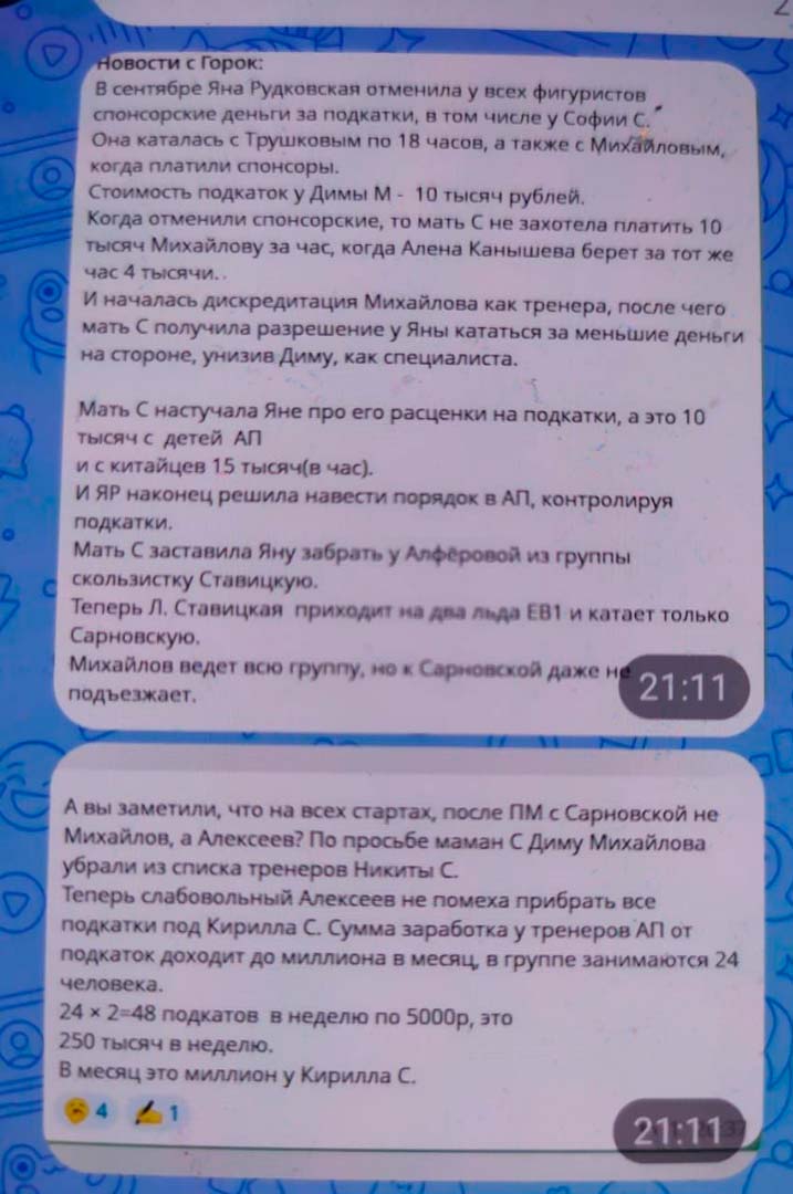 >— Она на ставке в «Ангелах Плющенко». У нас в академии работает шикарный тренер-прыжковик — Людмила Николаевна Алфёрова. Она мне рассказывала, что Сарновская переманивала учеников к Плющенко за процент. И Яна Александровна Рудковская также предлагала этим заниматься, но я отказалась. Мама Сарновских завидовала, что Плющенко и Рудковская финансово вкладываются в Парсегову, потому что раньше эти деньги уходили на её детей.