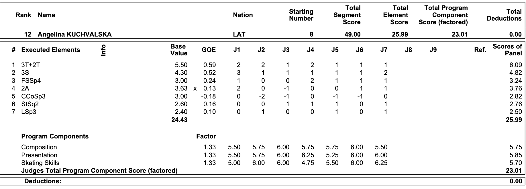 Алина Романовна КОРОЛЕВА с А.Ю., 13 лет (2012-01-11) СПб ГБУ ДО СШОР "Звёздный лёд" чёрный верх, белый низ 3f ho (R) 3z?3t<< (R) 3r< (R) 2aq? wobble (R) 3z на зубчик ho 2a<2t (R) 3r<2t (R) 3s chsq1 почти всё красное
