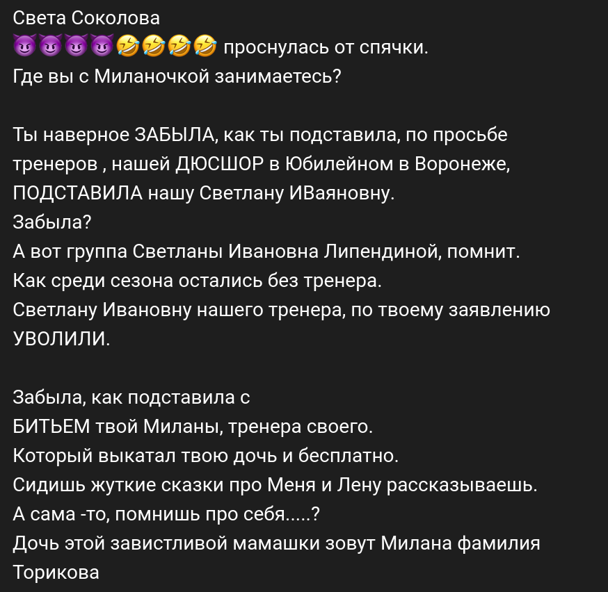 >Света Соколова 😈😈😈😈🤣🤣🤣🤣 проснулась от спячки. Где вы с Миланочкой занимаетесь? >Ты наверное ЗАБЫЛА, как ты подставила, по просьбе тренеров , нашей ДЮСШОР в Юбилейном в Воронеже, ПОДСТАВИЛА нашу Светлану Ивановну. Забыла? А вот группа Светланы Ивановна Липендиной, помнит. Как среди сезона остались без тренера. Светлану Ивановну нашего тренера, по твоему заявлению УВОЛИЛИ. >Забыла, как подставила с БИТЬЕМ твой Миланы, тренера своего. Который выкатал твою дочь и бесплатно. Сидишь жуткие сказки про Меня и Лену рассказываешь. А сама -то, помнишь про себя.....? >Дочь этой завистливой мамашки зовут Милана фамилия Торикова