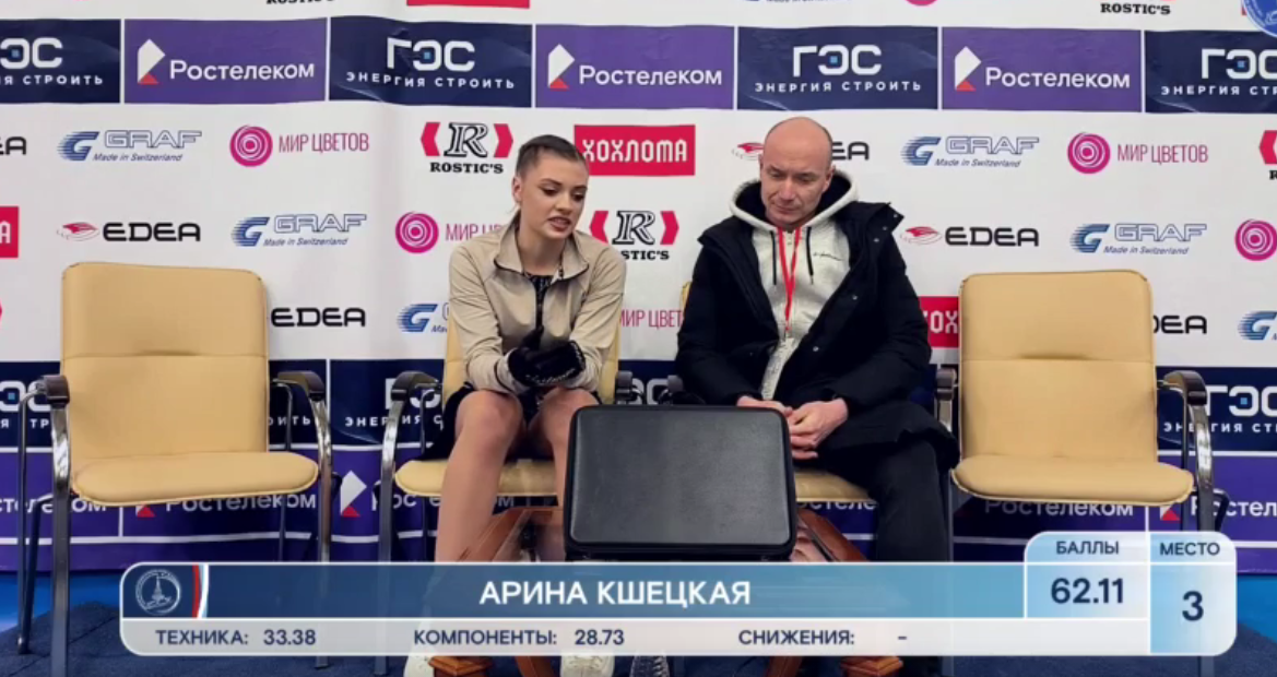 Анастасия Сергеевна ШИГИНА, 15 лет (2010-01-03) СПБ ГБУ ДО СШОР "Академия фигурного катания на коньках" где-то 2 минуты завязывает шнурки на коньке, её предусмотрительно не вызывают, чтоб не получить задержку старта (Костылевой с Региной Трусовой на заметку) 3r в дрыг 3f!<<?2t (R) 2aq с полугидроблейда Шигиной stsq2 хлопают