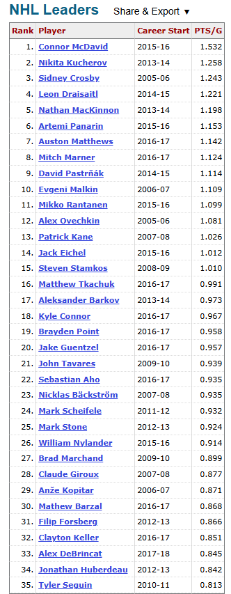 Кто там гнал, что Кучеров сдулся? У него уже 40 очков в 28 матчах! А это третье место среди лидеров по очкам за игру после Маккинона и Макдевида. Маккинон невероятный в этом сезоне, но сколько раз уже такое было, когда он не мог выдержать всю дистанцию и по итогу пропускал Кучерова вперёд. Короче, всё интересное тут впереди!