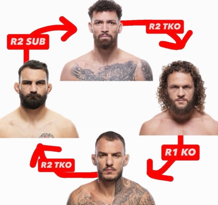 Последний относительно нормальный турнир в этом месяце А что за бои? В мейн карде Мешок ноунейм с усами вс. грустный, задумчиво смотрящий вдаль мешок ноунейм. Наверняка победит тот что с усами, потому что усы амортизируют удар и накапливают статическое электричество, придавая бодрости юному телу Пиваса - Тейшейра. Нынешнего Туивасу отпиздит даже инвалид, даже Мини-Хабиб, думаю даже Илюха Мэд ему напихает. Таллисон делает ему бразильскую попку в 1 раунде Физиев - Руффи. Это почти один и тот же боец, но так как Руффи по натуре своей ботан, а Физиев явно был хулиганом в школе, то должен иметь ментальное превосходство над очкариком. Физиев решением Проститутка вс. Святой Денис. Два ноускильных бомжа на которых Порье ездил до туалета, но один ещё и без кардио. Шлюхер решением Волкановски - Лопес. Поляк порвёт впопеса как щенка также как любой боец порвет чмоньку в этом итт треде, это любому понятно. Волкановски нокаутом в 3 раунде