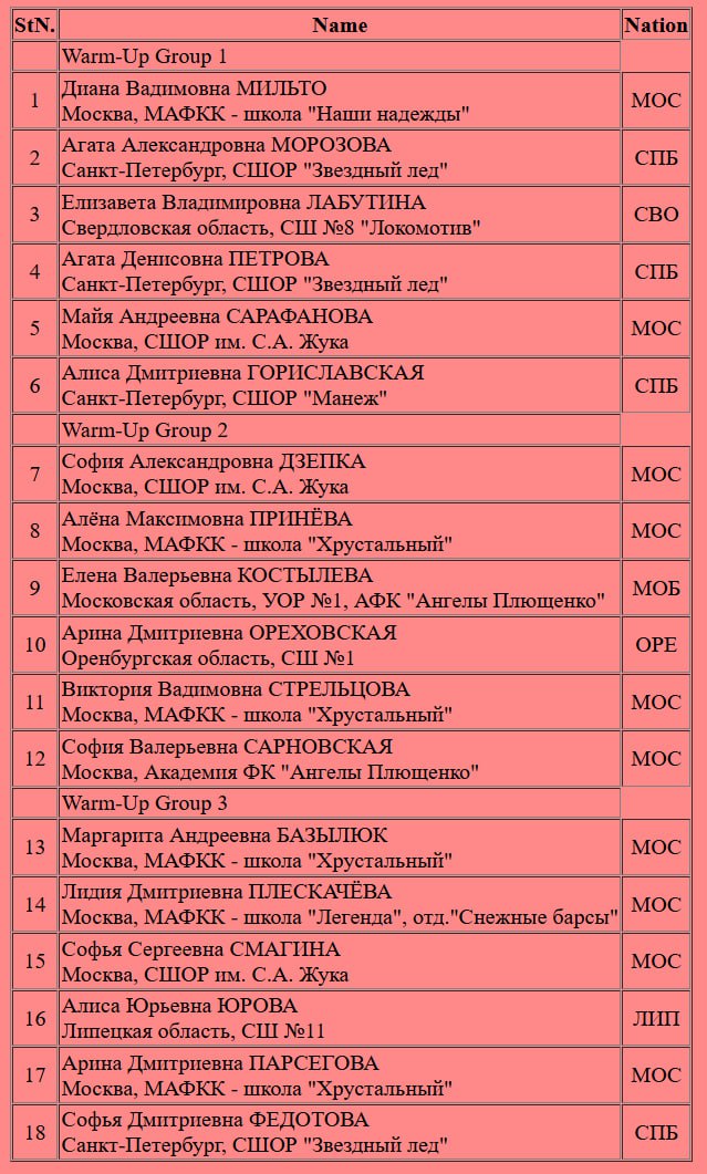 СФО, ДФО мл.гр.: 1. Виктория Александровна МЕРКУЛОВА >>3281143 Новосибирская область, МАУДО СШОР "ЦЗВС" г. Новосибирск 2.Полина Артёмовна СМИРНОВА >>3281145 Новосибирская область, МАУДО СШОР "ЦЗВС" г. Новосибирск 3. Мария Викторовна НАДЁЖКИНА >>3281142 Омская область, "БУ ДО СШОР No 35" г. Омск 4. Ульяна Денисовна ДОРОХОВА >>3281140 Красноярский край, КГАУ ДО "СШ "Центр по ЛВС" г. Красноярск