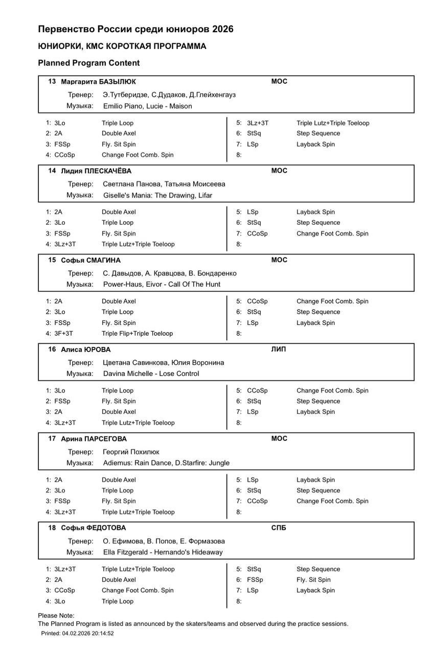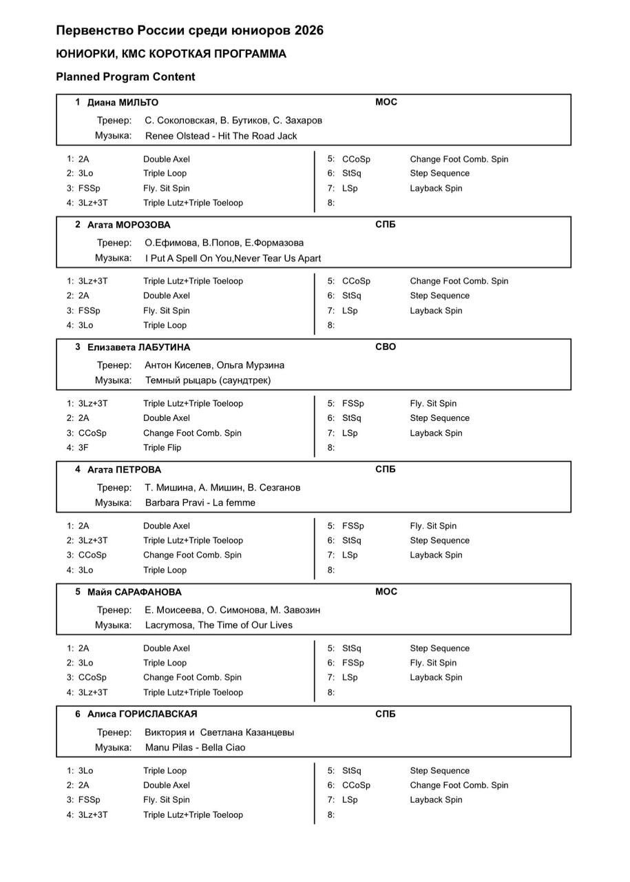 05 февраля 14.00-16.20 – Девушки, короткая программа https://fsrussia.ru/results/2526/junnat2526/SEG003.HTM 16.40-17.10 – Открытие соревнований 17.10-19.30 – Юноши, короткая программа 19.45-21.50 – Танцы на льду, ритм танец