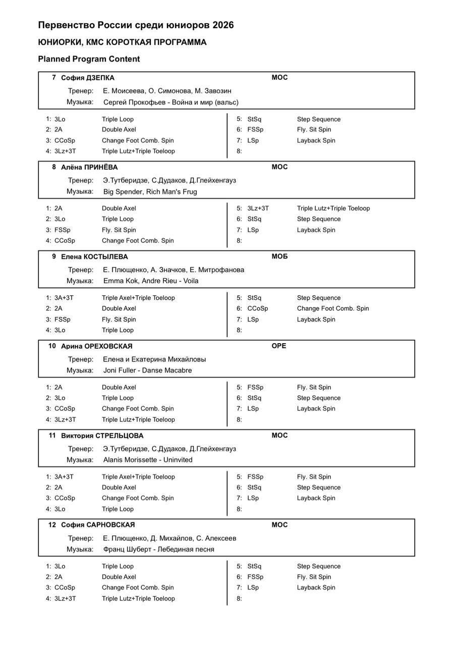София Владиславовна ПАРИЦКАЯ Приморский край, МБУ ДО СШ "Темп" г. Артём Похожа на Вагину и фигуристку Москвича 2z 3t fall 3t fall +rep chsq1 разворот в слайде, пвш в выпад 2a2t1a 2z2r 2a в подпрыжку и бежит на зубчиках не успела?